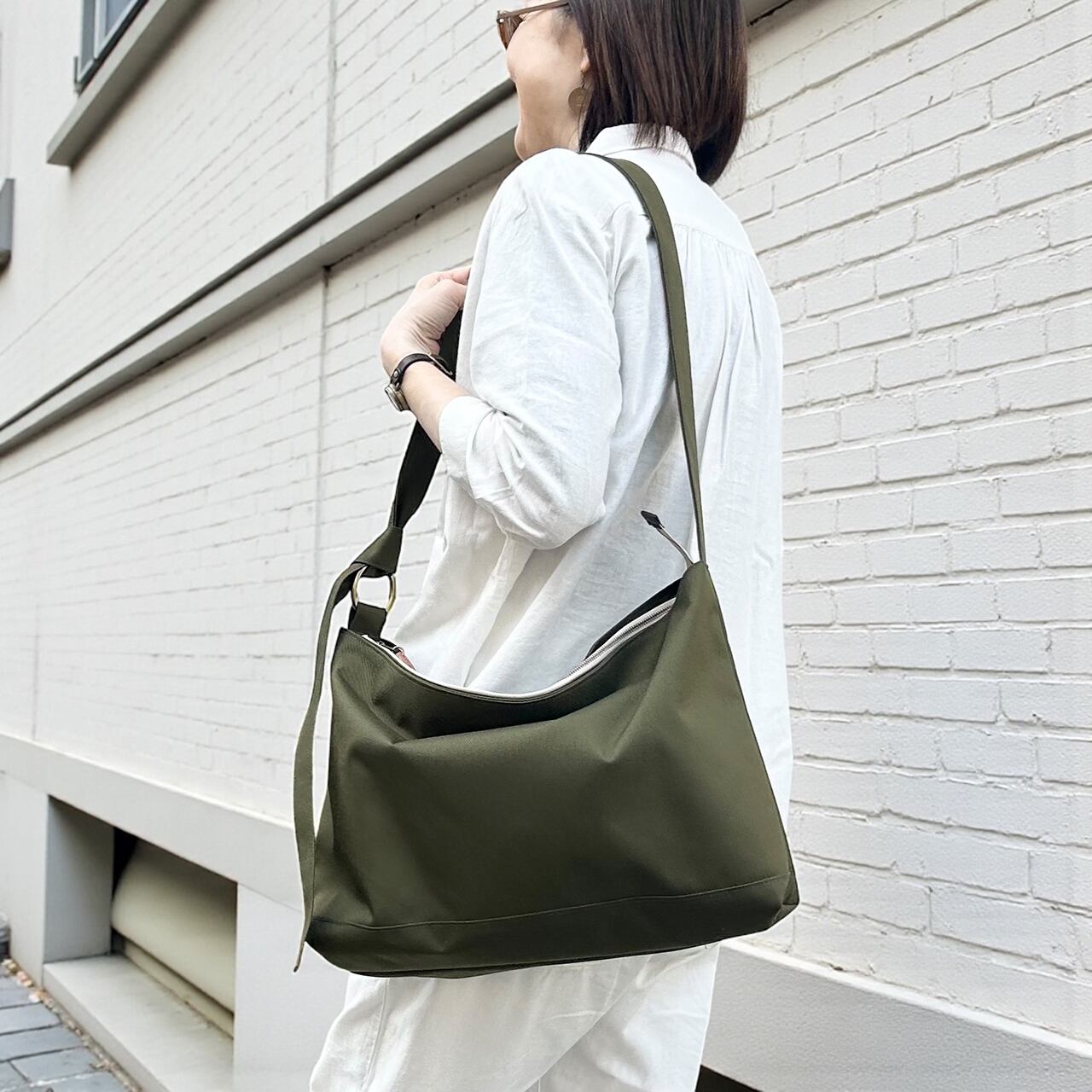 三角形のシンプルなホーボーバッグ。幅広の肩紐に、大きく開けた肩口はスマートに肩にかけることができます。 また大きなエコバッグのようなフォルムは荷物をたっぷり入れることができ、内ポケットも深めのものが4つあるので整理もしやすいです。