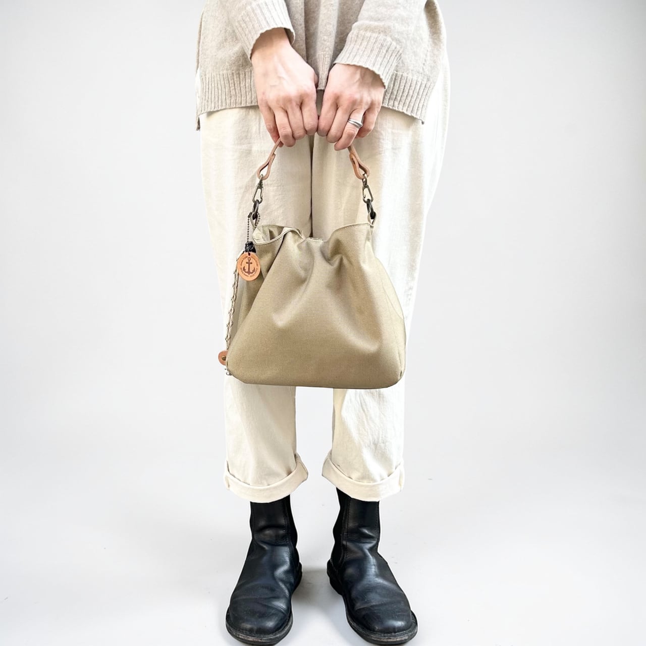 〇レザーハンドルと巾着紐の組み合わせは「革ベージュ×紐ベージュ」「革ブラック×紐グレー」となります。