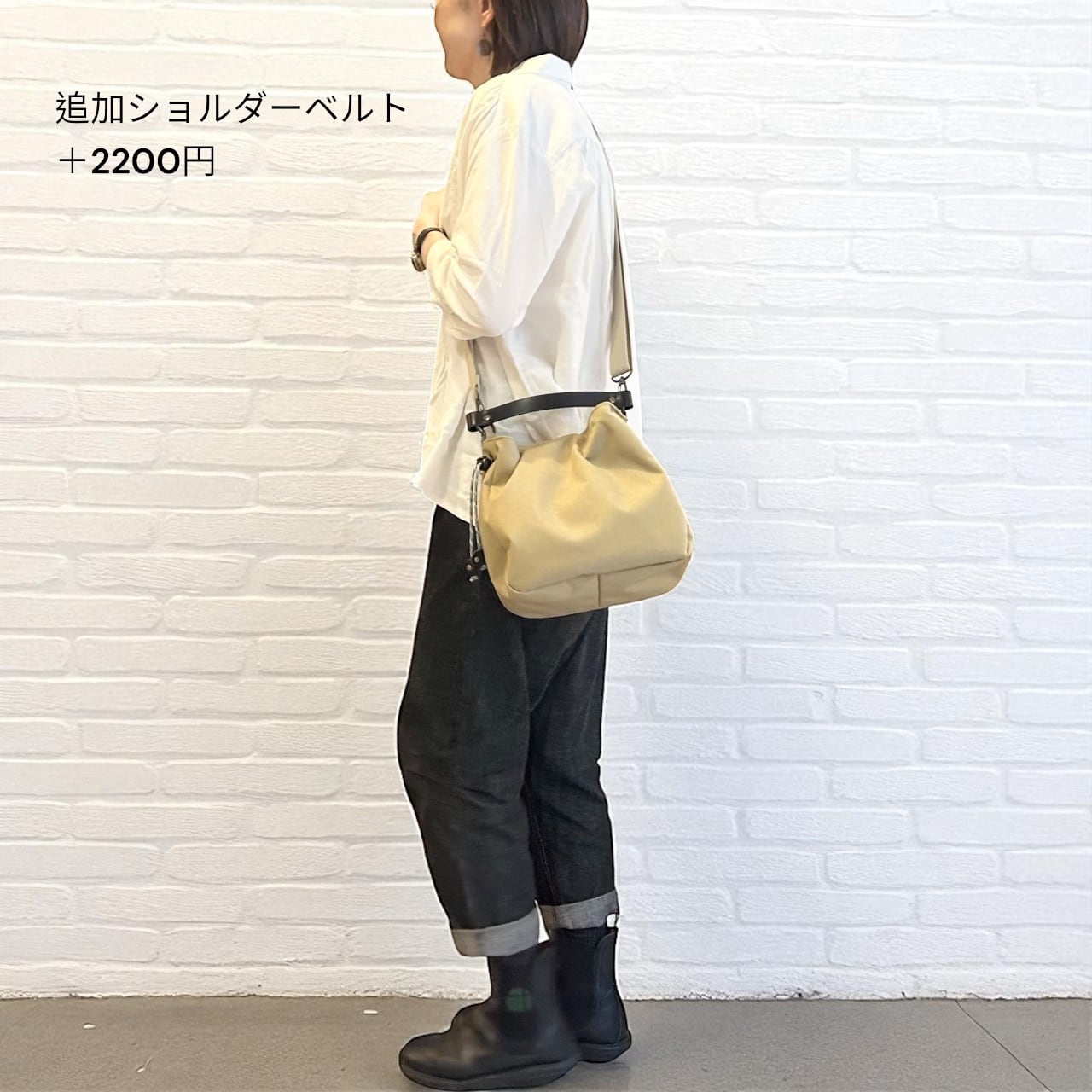 巾着の締め具合で形が変わるので、お好みのフォルムでお使いください。また追加でショルダベルトもご用意しています。こちらも斜め掛けがお好きな方はぜひご活用ください。