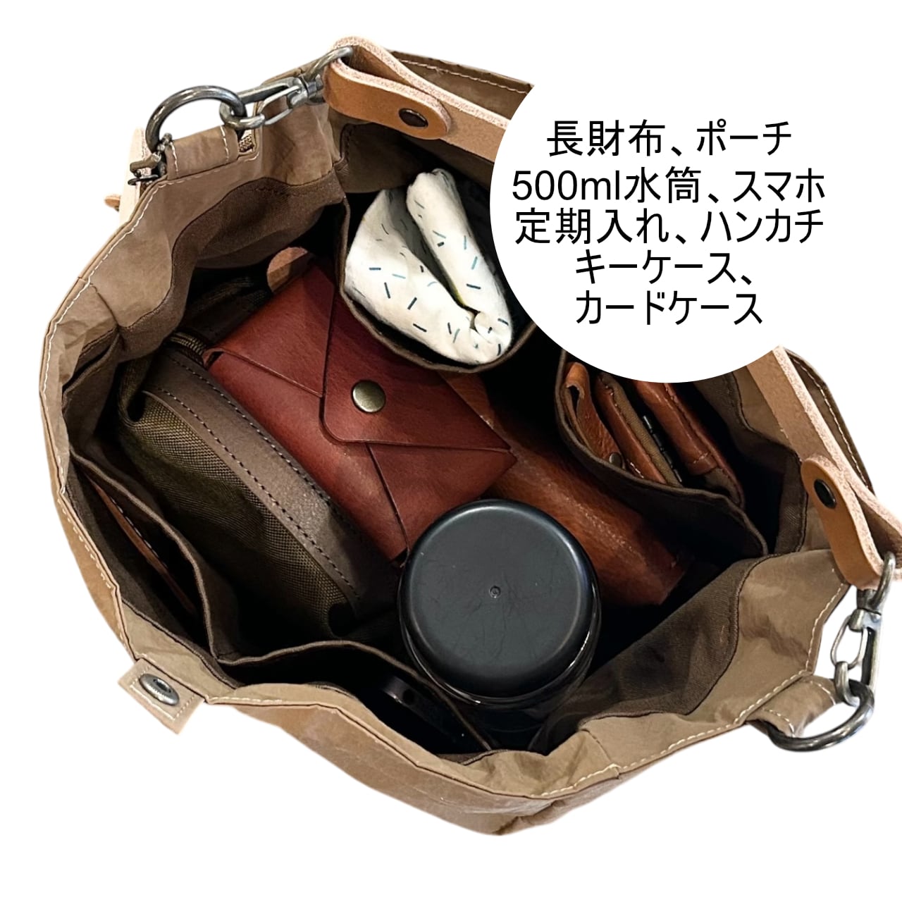 画像のバッグの中身は長財布、ポーチ、350mlペットボトル、キーケース、ハンカチ、スマートフォン、メモ帳