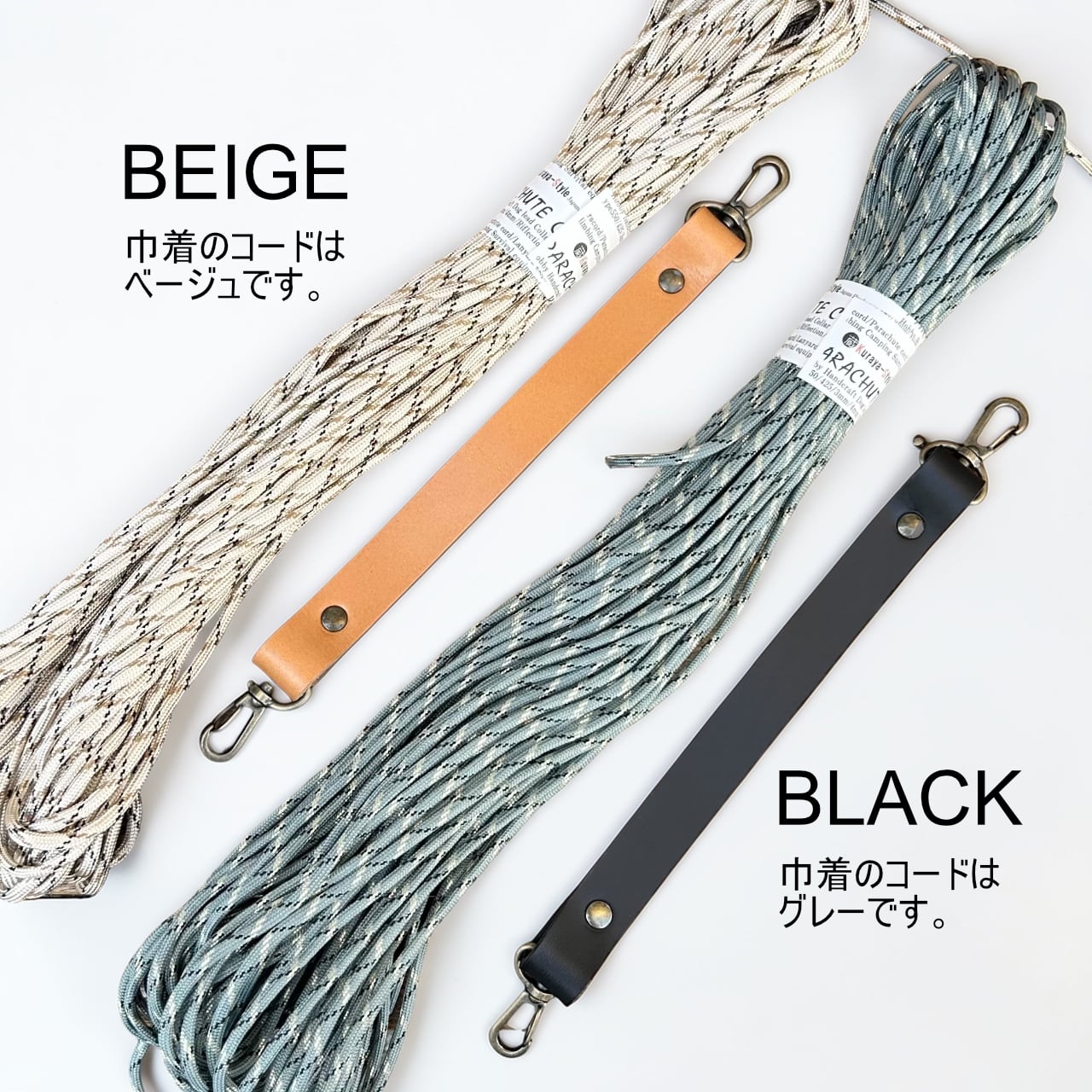 〇レザーハンドルと巾着紐の組み合わせは「革ベージュ×紐ベージュ」「革ブラック×紐グレー」となります。