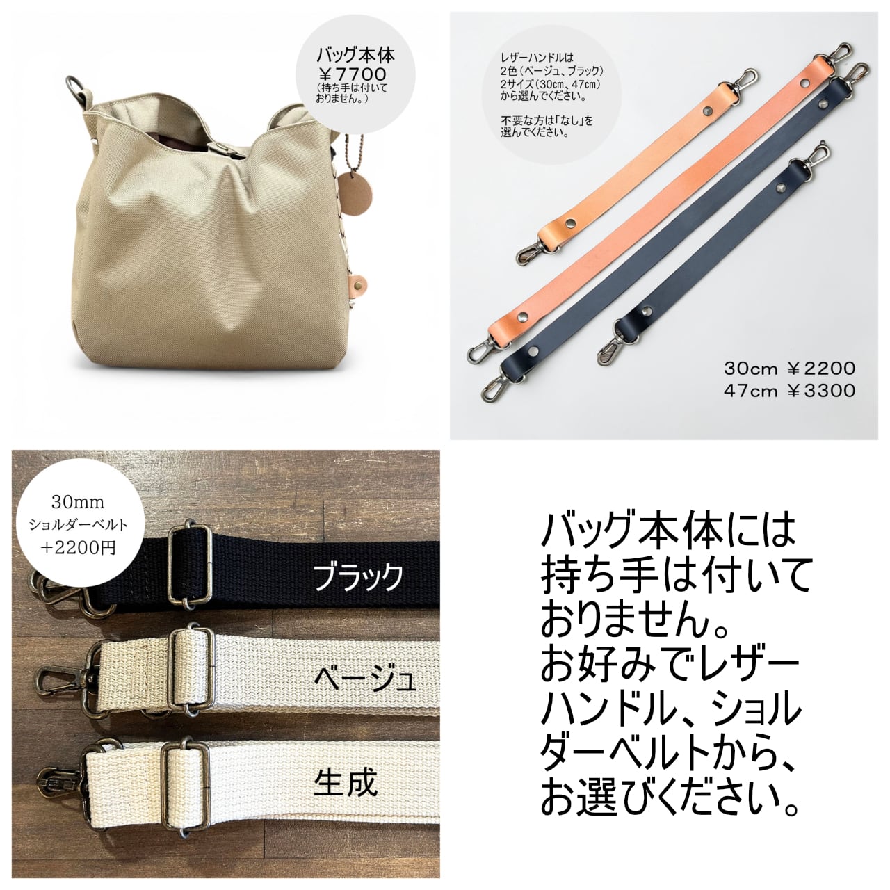 〇バッグには持ち手(レザーハンドル)は含まれておりません。必要な方はご購入のさいに色、サイズなど選んでください。