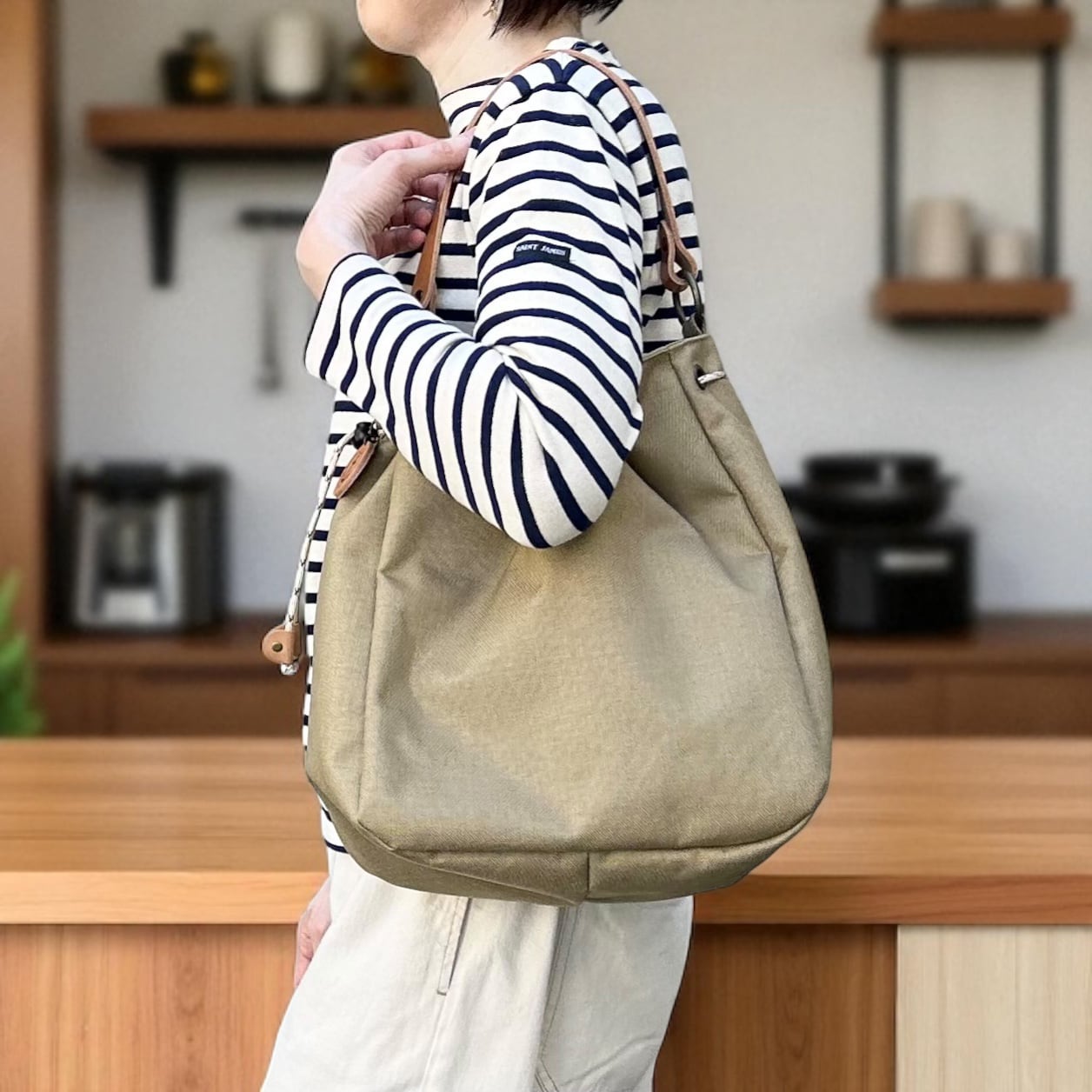 巾着を絞ることで風船のようにふっくら丸くなるバッグ。