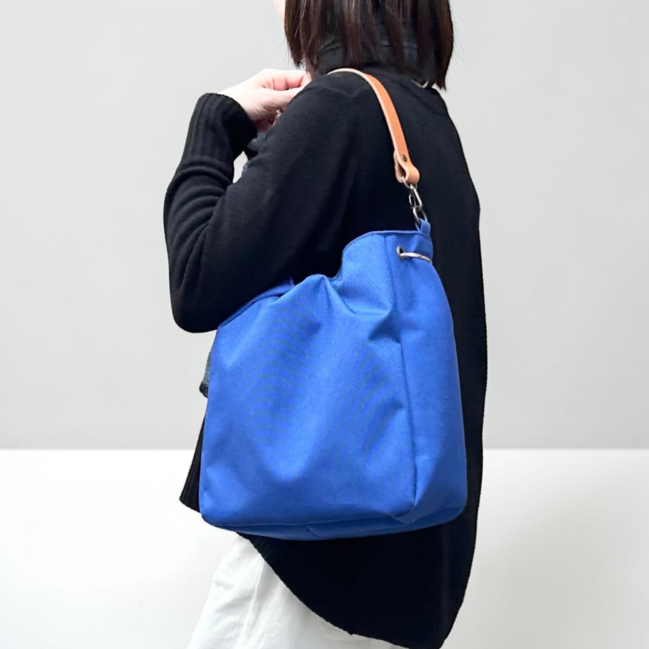 巾着を絞ることで風船のようにふっくら丸くなるバッグ。