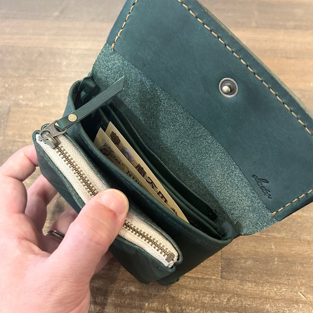 独特のフォルムながらも使っていくうちに病みつきになるmare-walletにミニバージョンが誕生しました!ミニバージョンは外のファスナーポケットが付いているものと付いていないものの2種類ございます。サイズは定番の長財布をほぼそのままに3分の2ほど幅になっており、お札は2つ折りで入れていただく仕様になっております。コンパクトですが、なかなか使える財布ですよ。