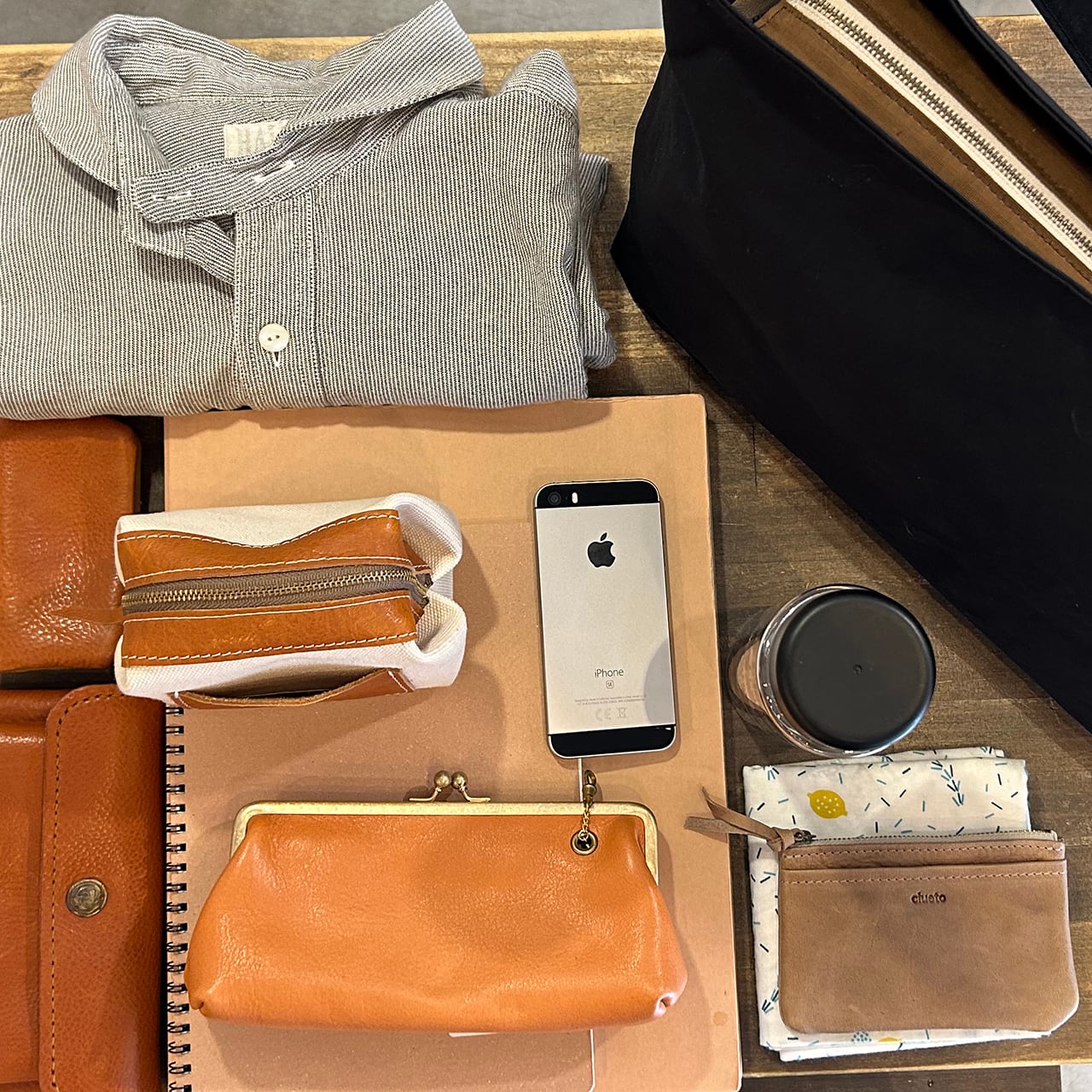 〇写真のMサイズにはA4ファイル、B5ノート、シャツ、長財布、ポーチ、がま口ポーチ、水筒(500ml)、レザーポーチ、スマートフォン、キーケース、ハンカチ、メモ帳を入れています。