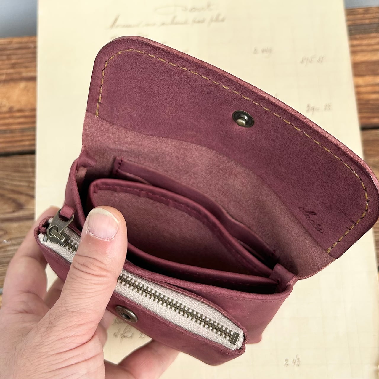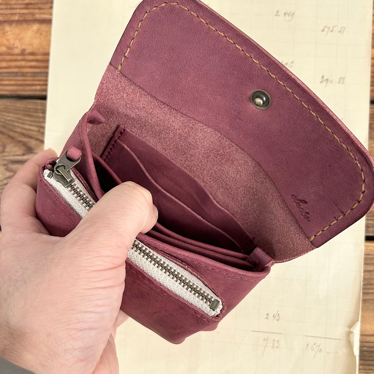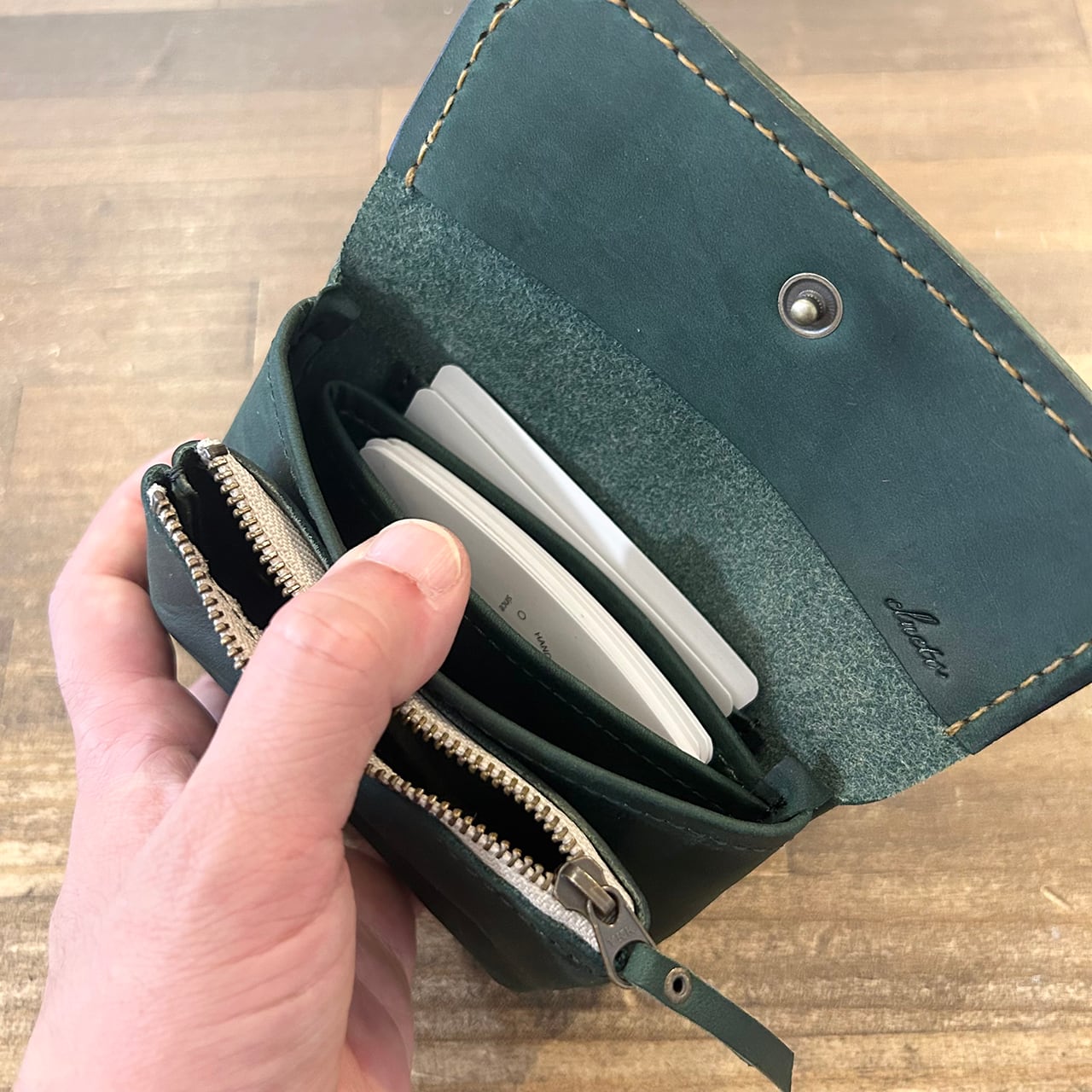 独特のフォルムながらも使っていくうちに病みつきになるmare-walletにミニバージョンが誕生しました!ミニバージョンは外のファスナーポケットが付いているものと付いていないものの2種類ございます。サイズは定番の長財布をほぼそのままに3分の2ほど幅になっており、お札は2つ折りで入れていただく仕様になっております。コンパクトですが、なかなか使える財布ですよ。