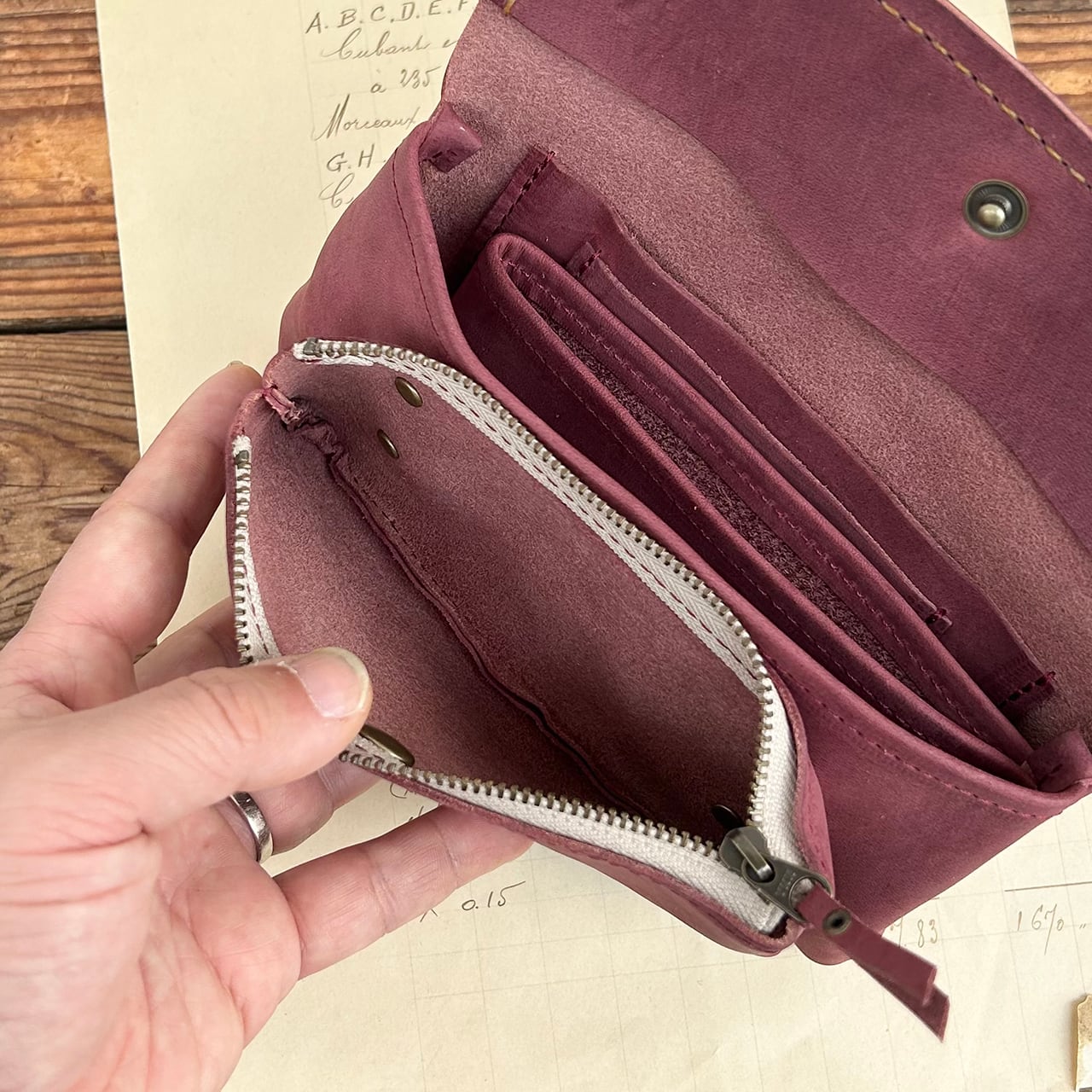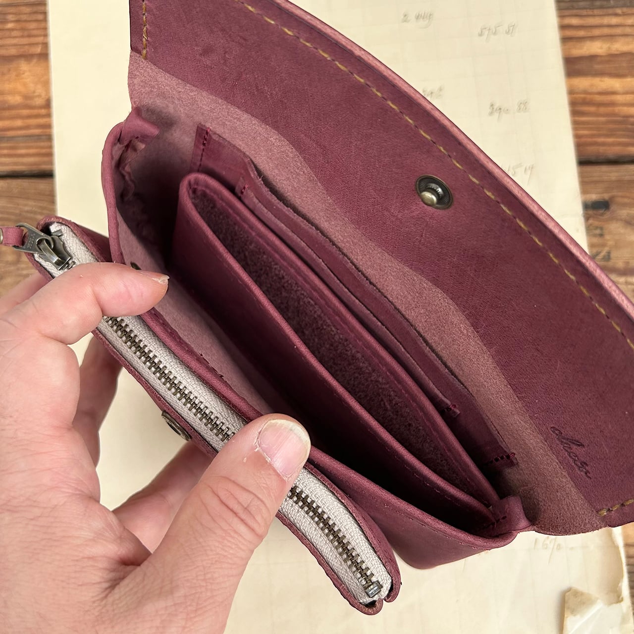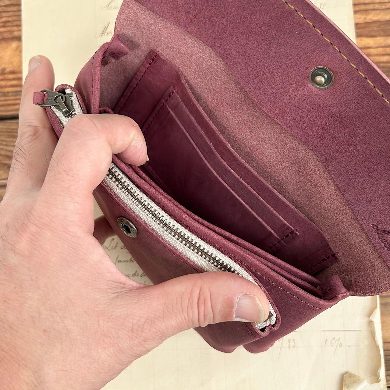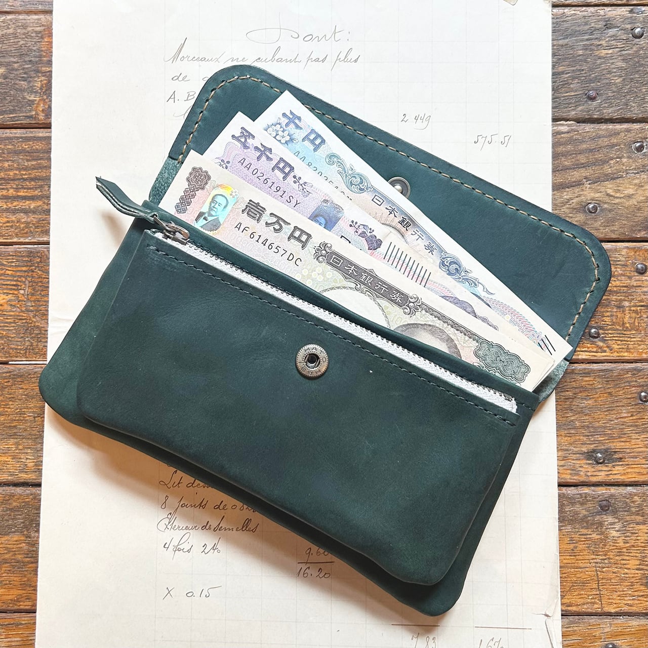 独特の形に戸惑う方も多いですが、このポーチのように放り込むように入れるお財布は使い始めると病みつきになります。