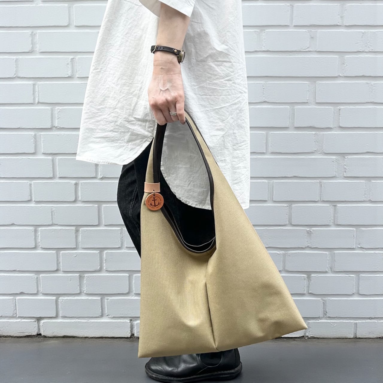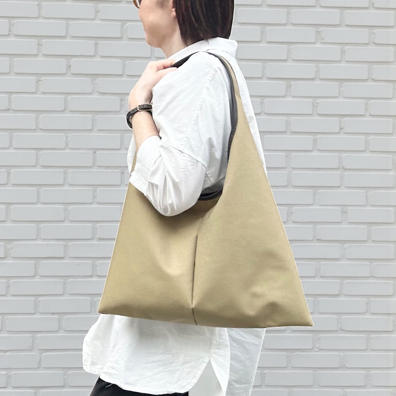 三角形のシンプルなホーボーバッグ。幅広の肩紐に、大きく開けた肩口はスマートに肩にかけることができます。