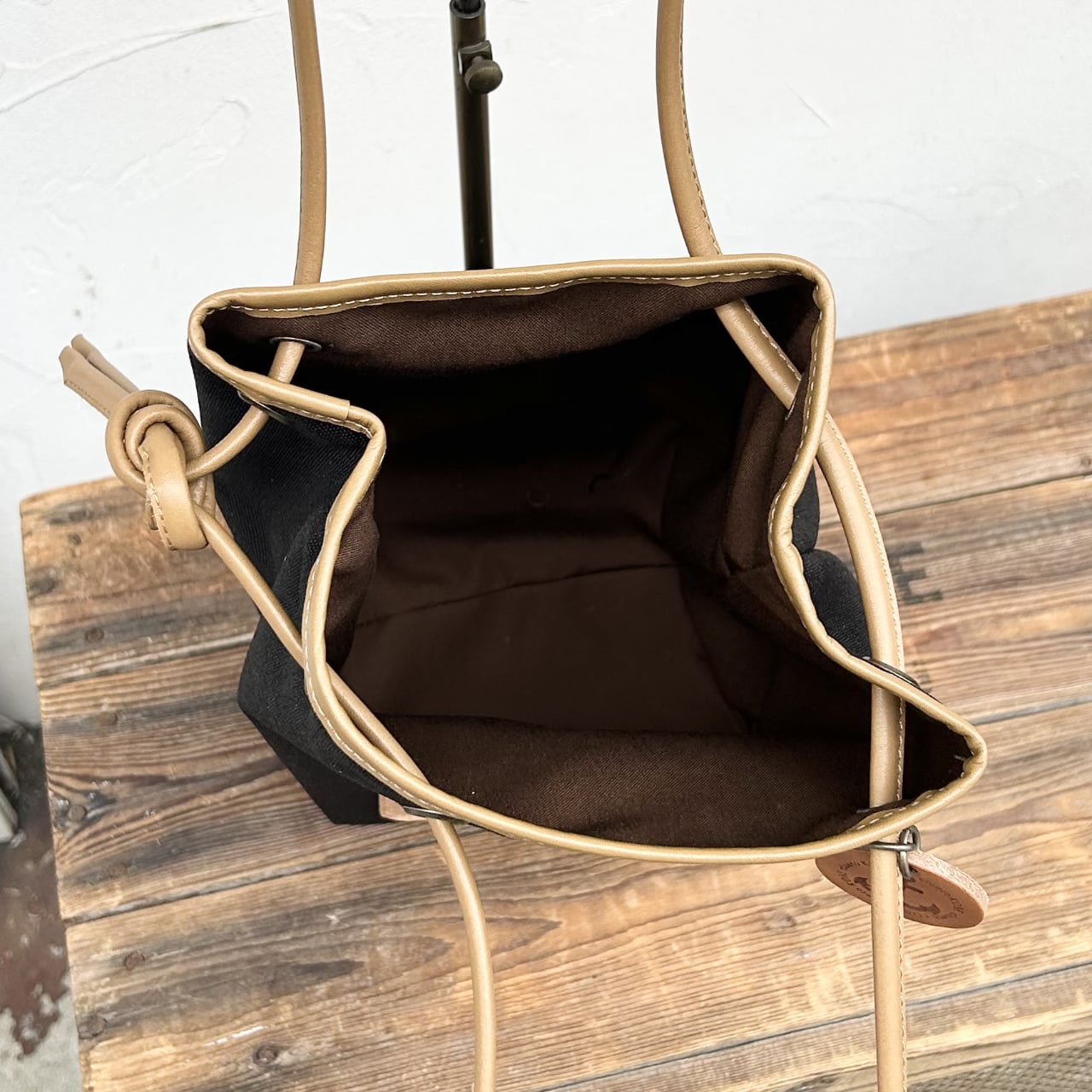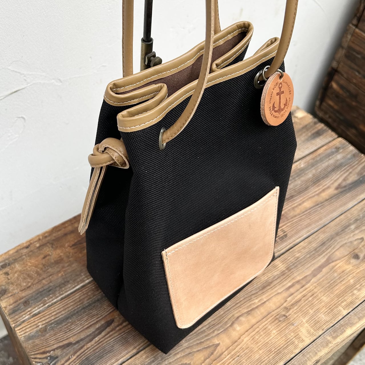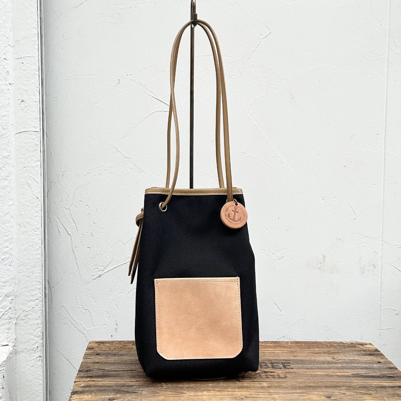 nico:ブラック×ベージュ(撥水加工ナイロン素材×イタリアンレザー巾着バッグ)受注製作