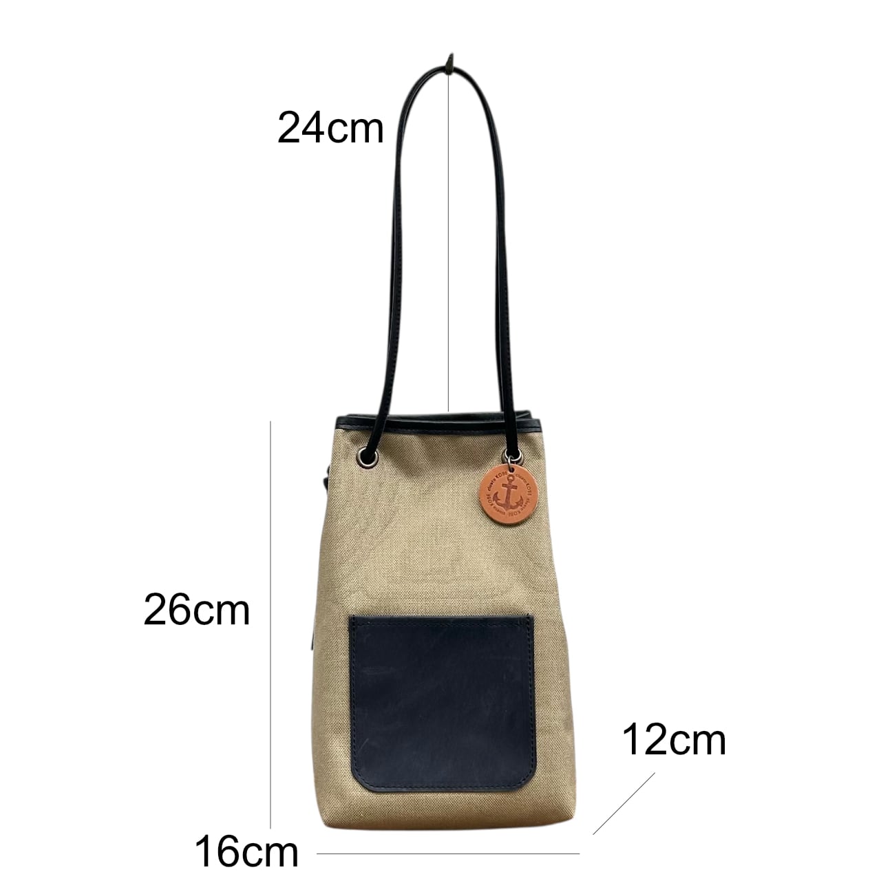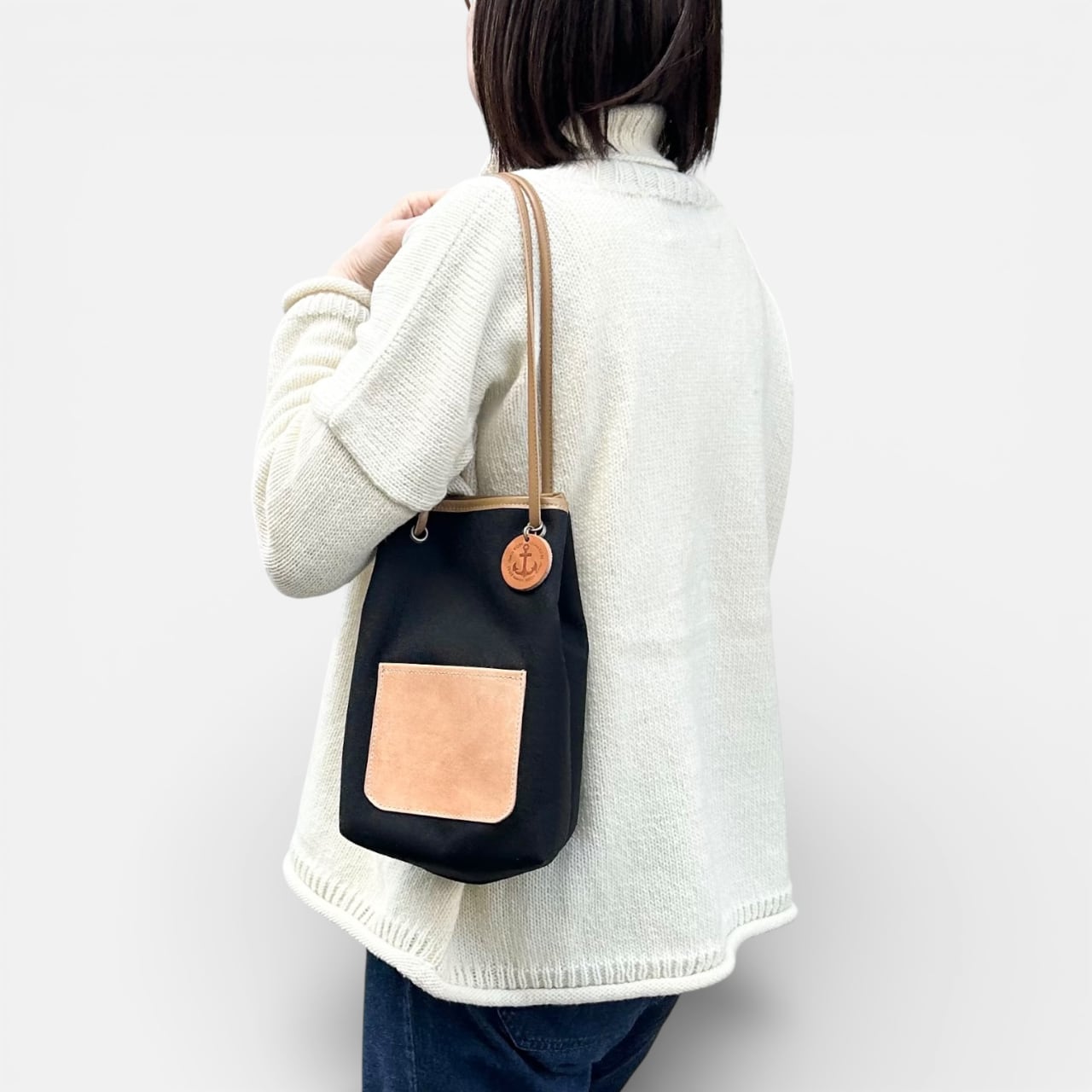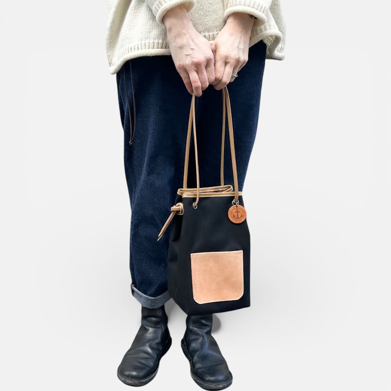 nico:ブラック×ベージュ(撥水加工ナイロン素材×イタリアンレザー巾着バッグ)受注製作