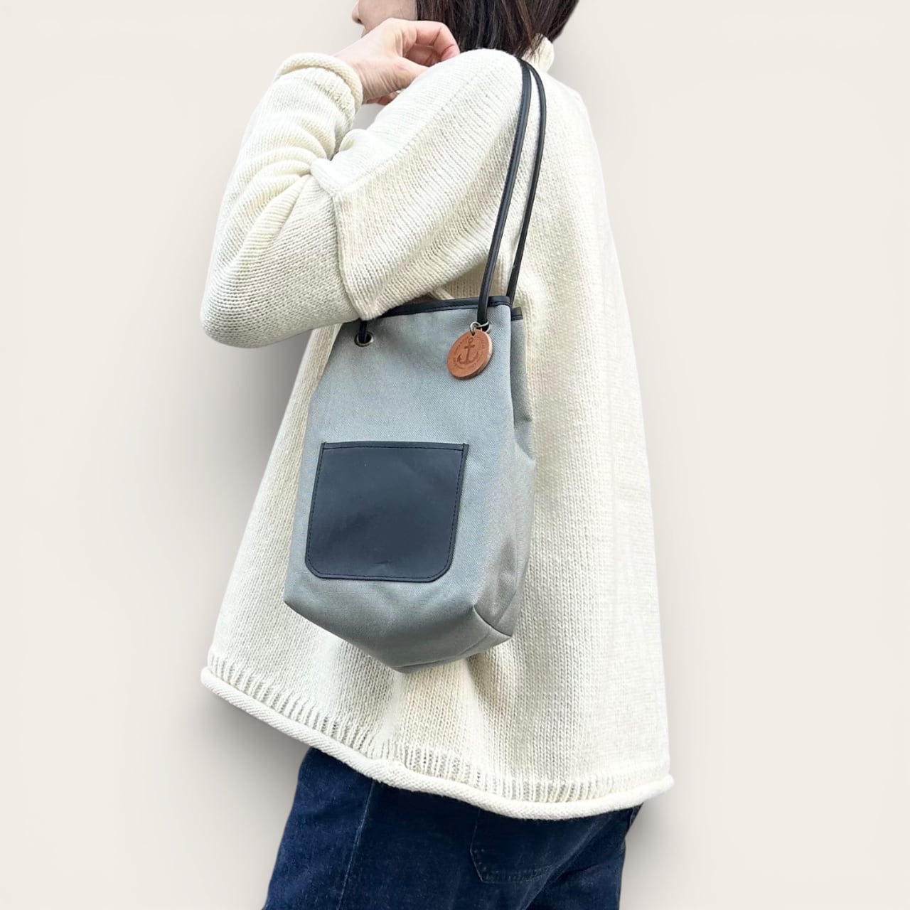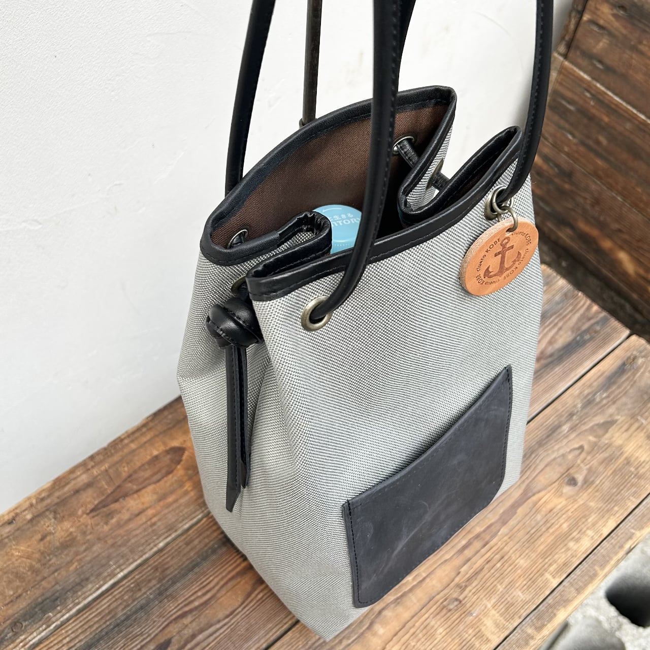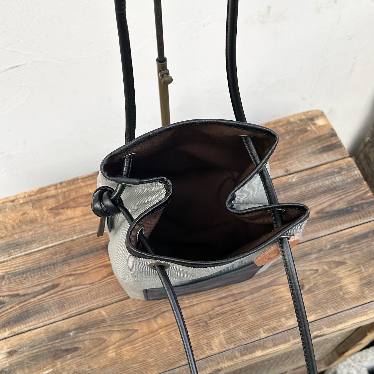 nico:グレー×ブラック(撥水加工ナイロン素材×イタリアンレザー巾着バッグ)受注製作