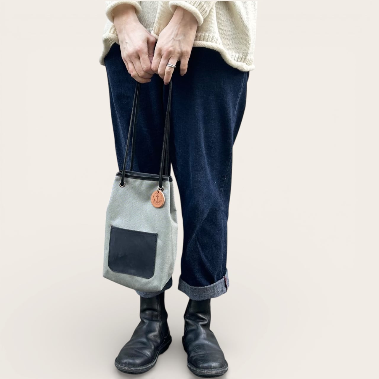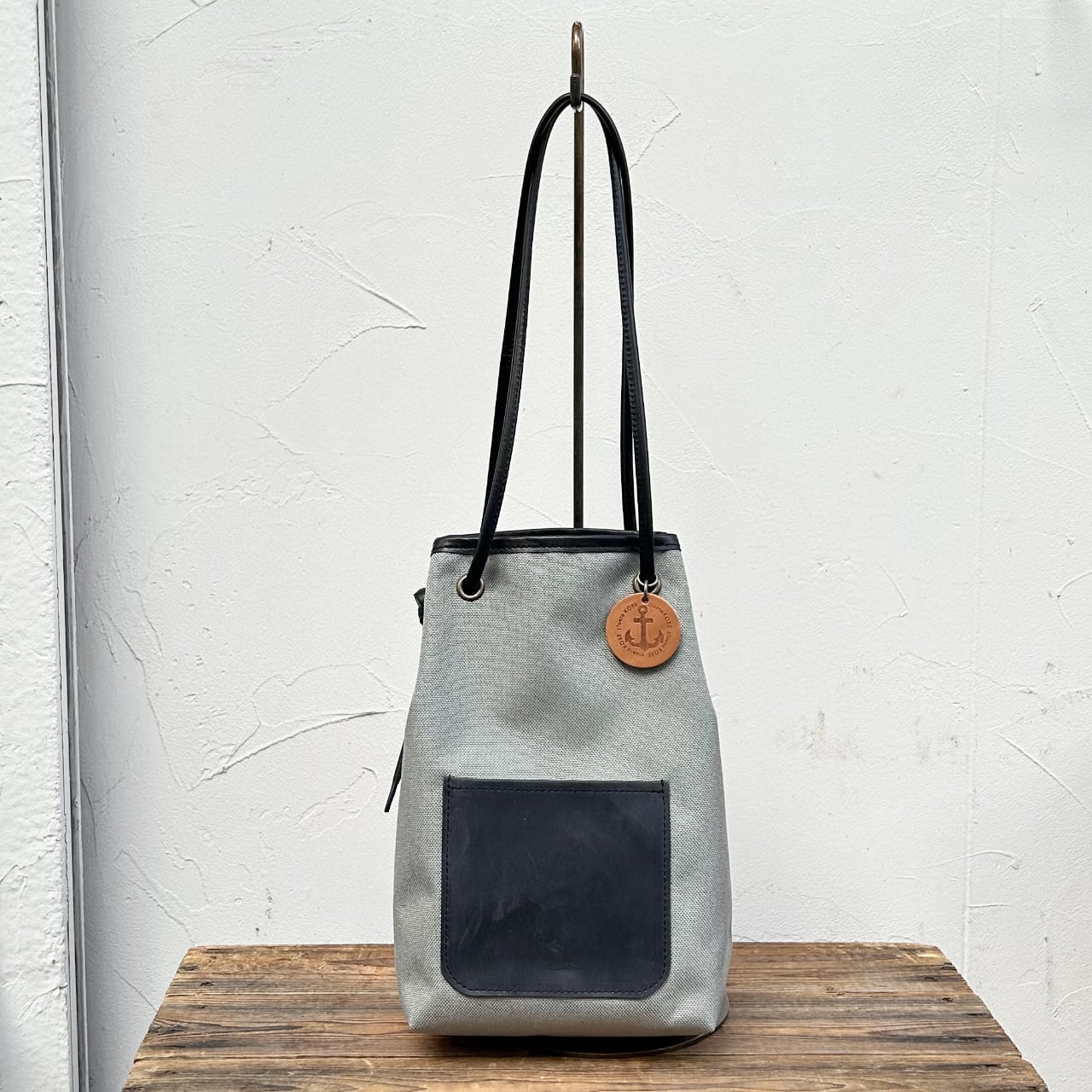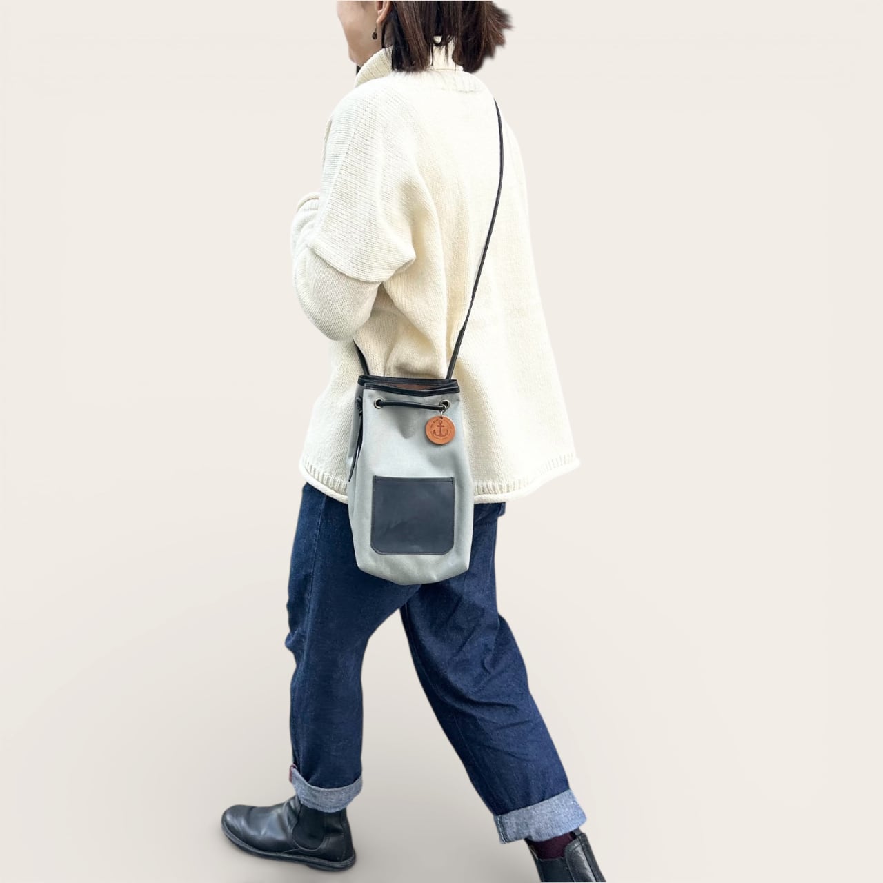nico:グレー×ブラック(撥水加工ナイロン素材×イタリアンレザー巾着バッグ)受注製作