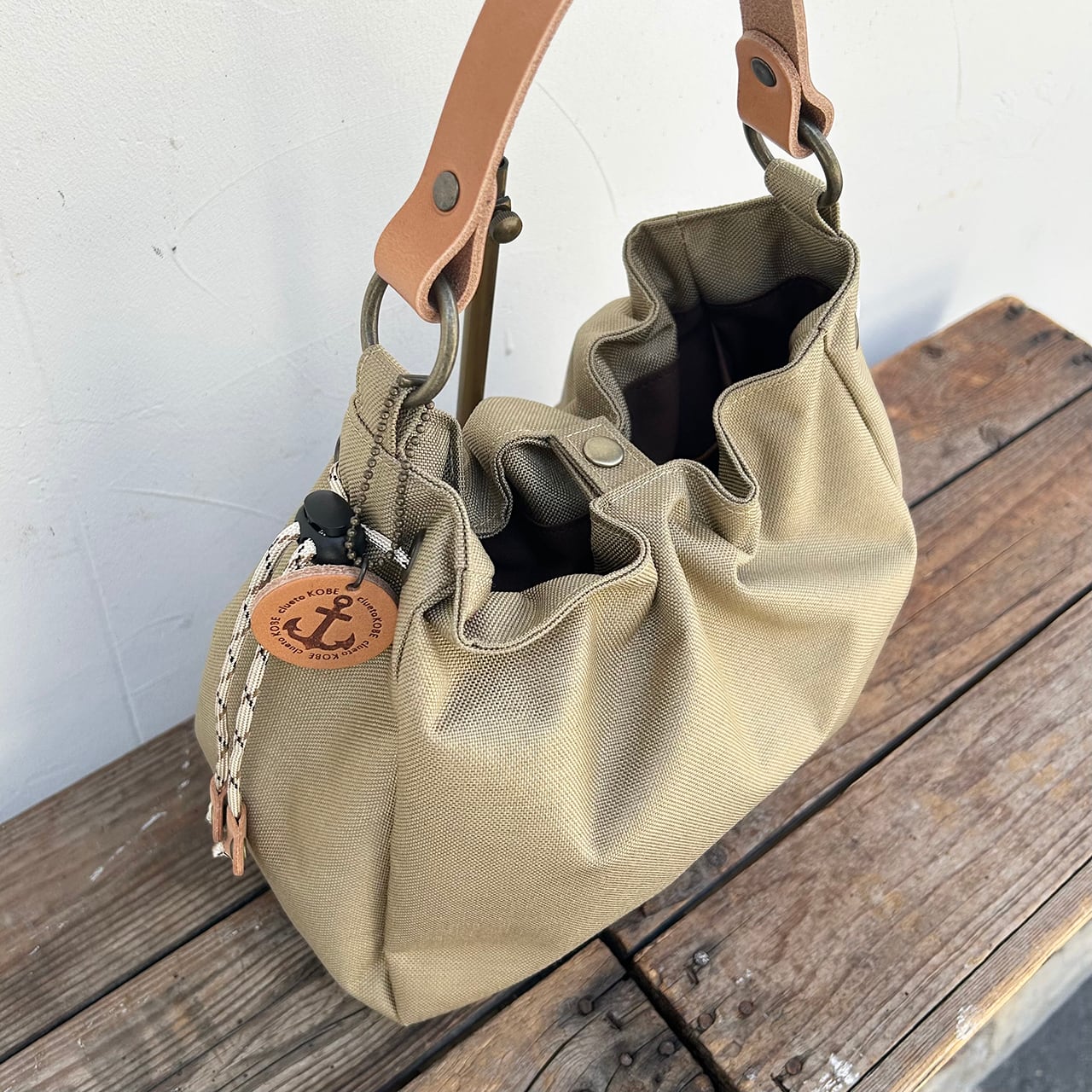 (表地)ナイロン、(裏地)綿、(持ち手)牛革、(巾着紐)ポリエステル