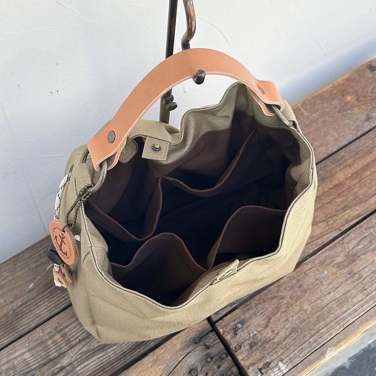 持ち手は栃木レザーを採用。植物性のタンニン鞣しのレザー。使い込むほどに味わい深い風合いになっていきます。