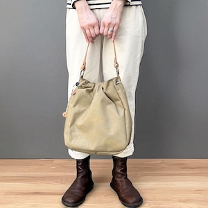 巾着を絞ることで風船のようにふっくら丸くなるバッグ。