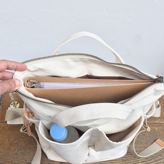 小さいサイズですが、A4サイズのファイルも収まり、外のポケットには500mlのペットボトルもスッポリ入ります。普段のお出かけには十分なサイズです。