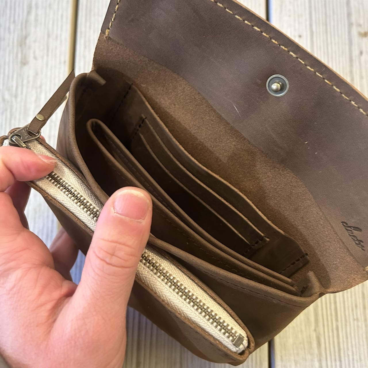 〇前に小さめのファスナー付ポーチ(主に小銭入れ)、後ろに札入れとカードなど収納できます