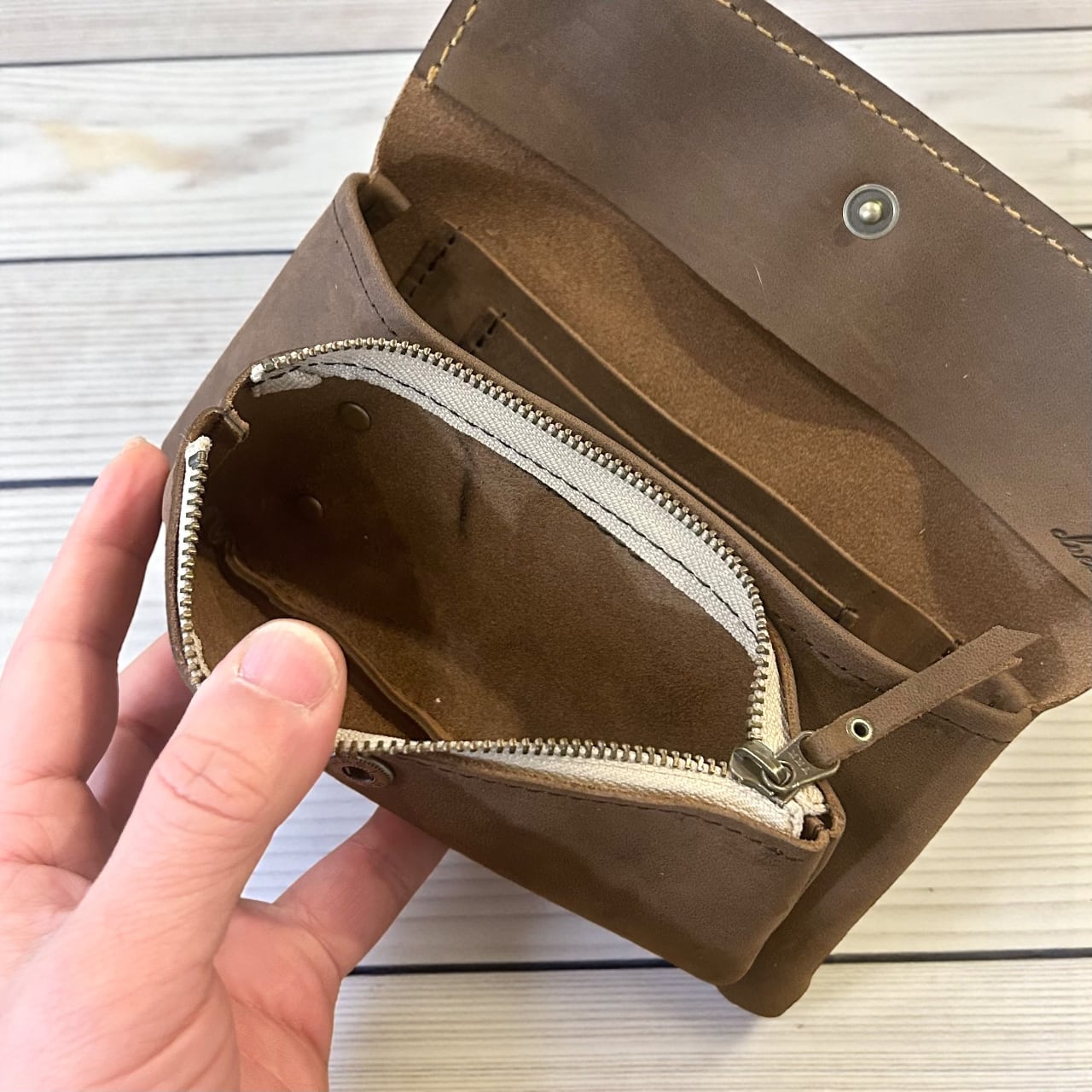 また、シングルバットという牛の背中からお尻にかけての繊維が詰まった部位を使用しており、バケッタ製法でオイルをたっぷり含侵させているので、コシがありながらもっちりとした質感です。