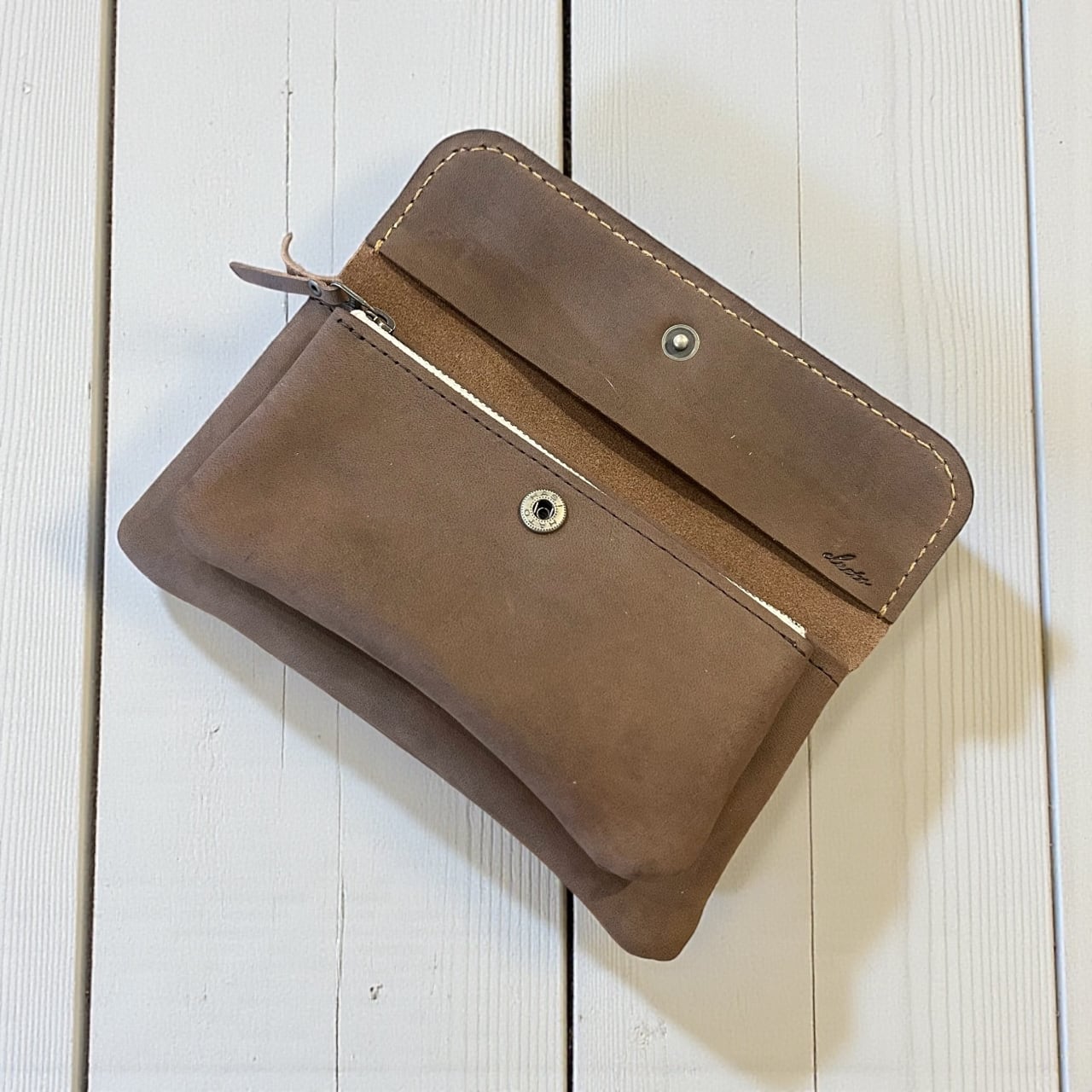 独特の形に戸惑う方も多いですが、このポーチのように放り込むように入れるお財布は使い始めると病みつきになります。