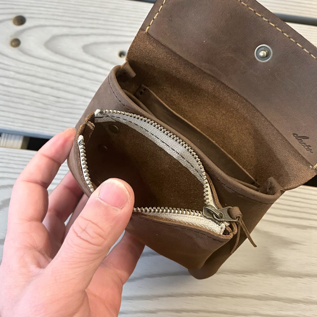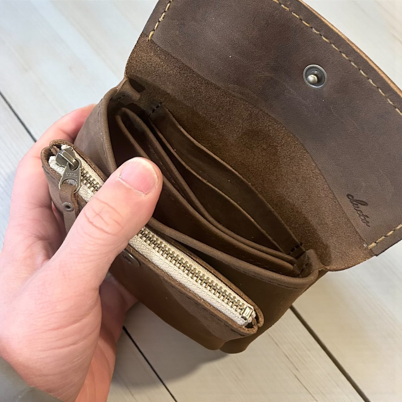 独特のフォルムながらも使っていくうちに病みつきになるmare-walletにミニバージョンが誕生しました!ミニバージョンは外のファスナーポケットが付いているものと付いていないものの2種類ございます。サイズは定番の長財布をほぼそのままに3分の2ほど幅になっており、お札は2つ折りで入れていただく仕様になっております。コンパクトですが、なかなか使える財布ですよ。
