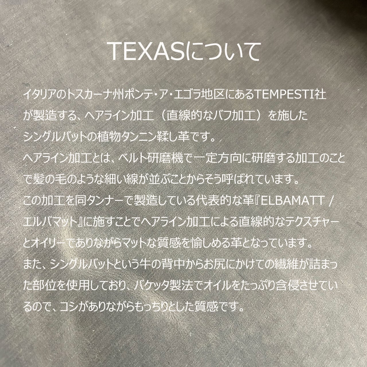 イタリアのトスカーナ州ポンテ・ア・エゴラ地区にあるTEMPESTI社が製造する、ヘアライン加工(直線的なバフ加工)を施したシングルバットの植物タンニン鞣し革です。
