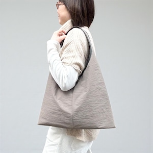 三角形のシンプルなホーボーバッグ。幅広の肩紐に、大きく開けた肩口はスマートに肩にかけることができます。