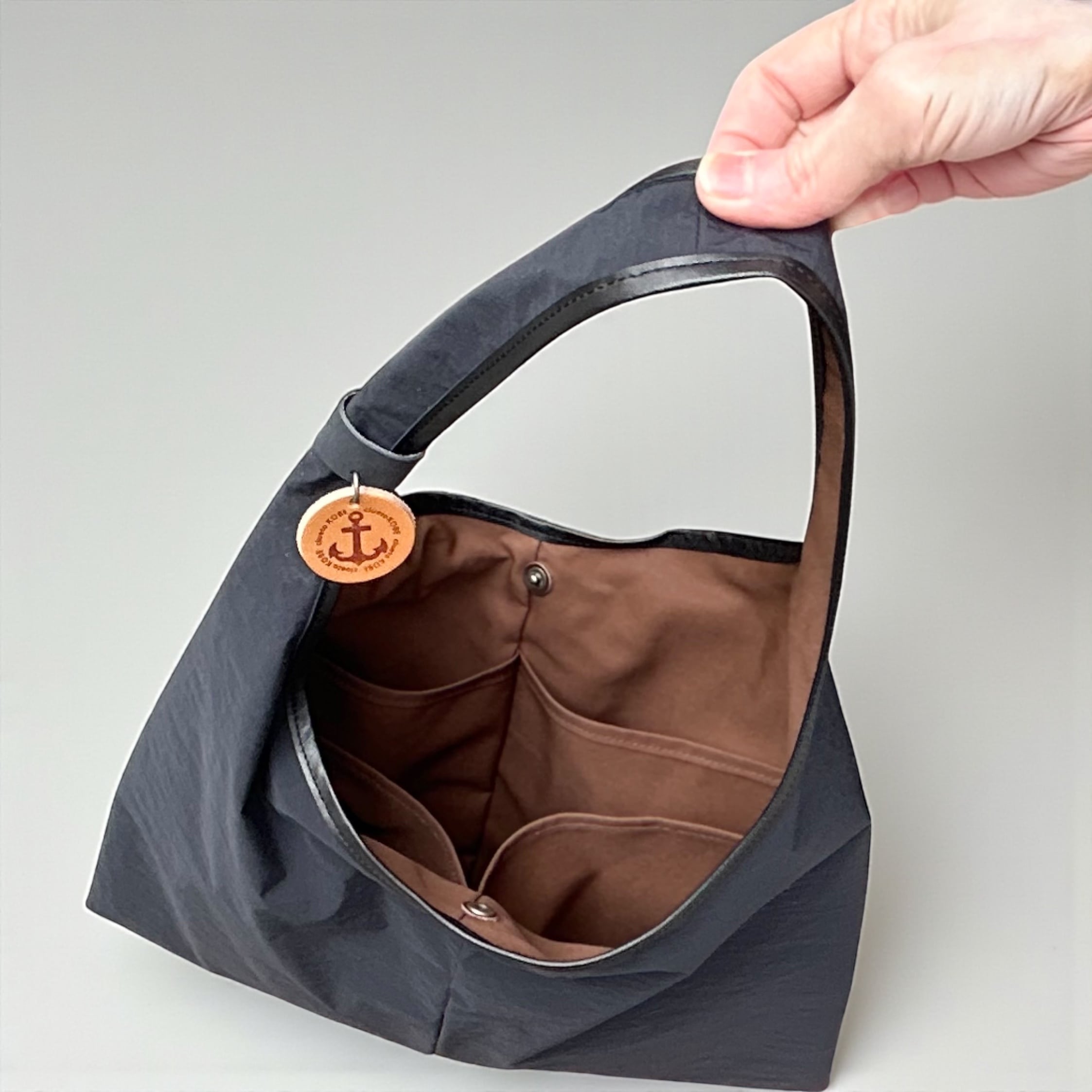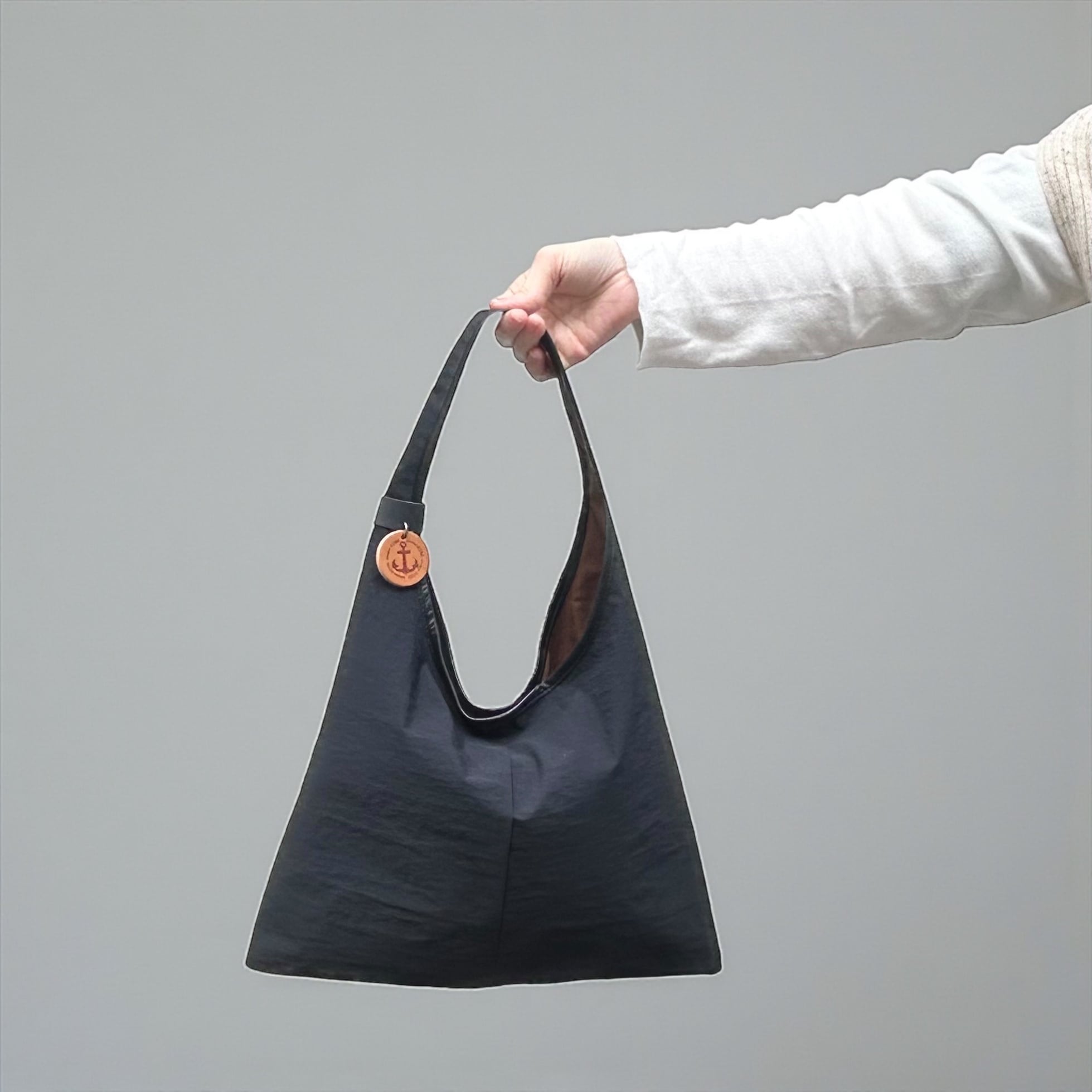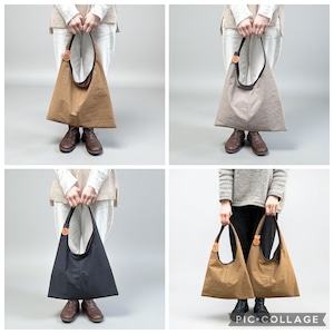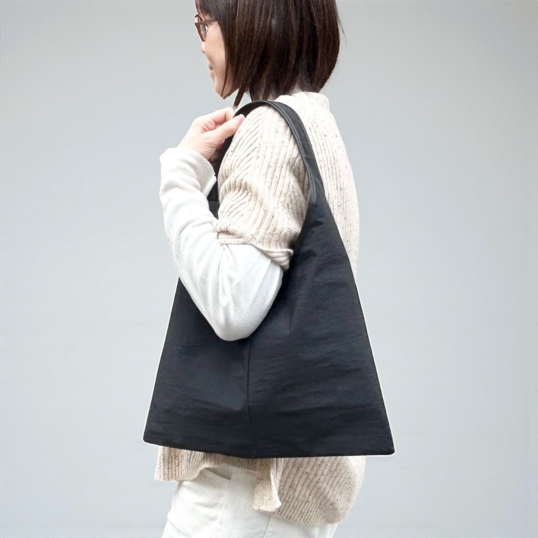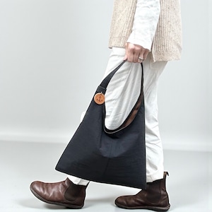 三角形のシンプルなホーボーバッグ。幅広の肩紐に、大きく開けた肩口はスマートに肩にかけることができます。