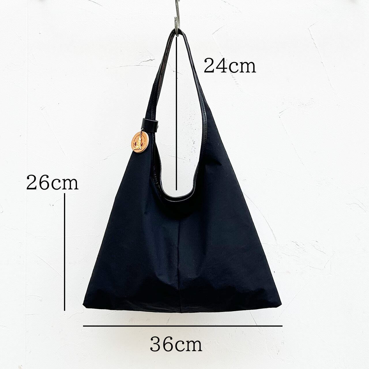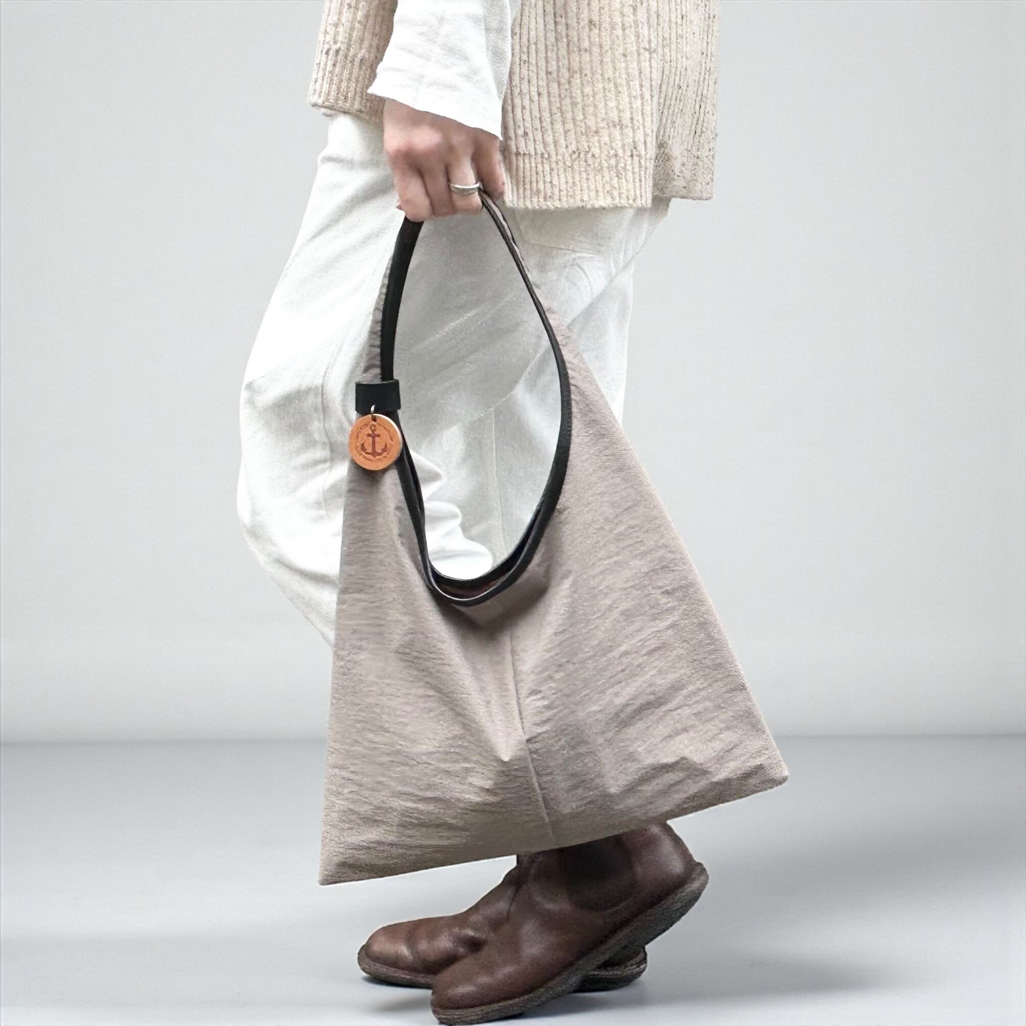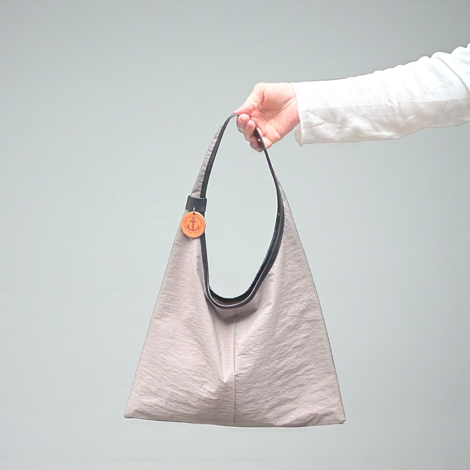 三角形のシンプルなホーボーバッグ。幅広の肩紐に、大きく開けた肩口はスマートに肩にかけることができます。