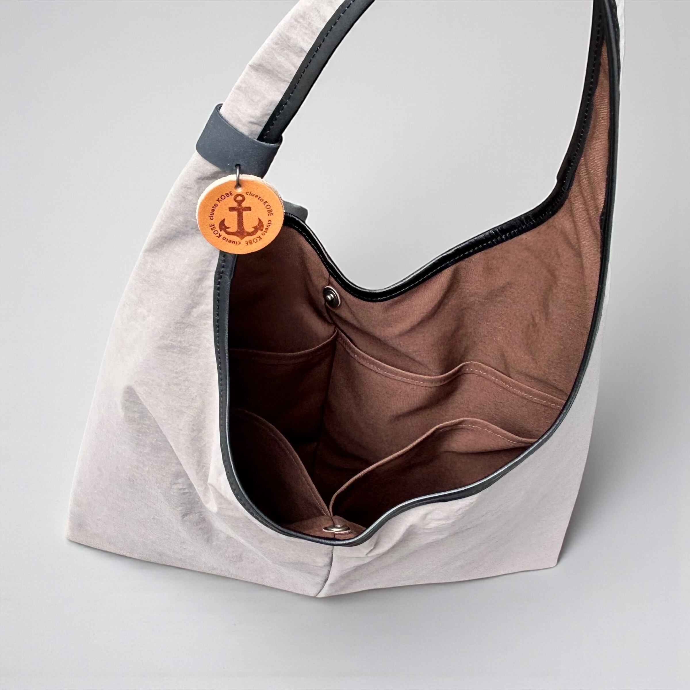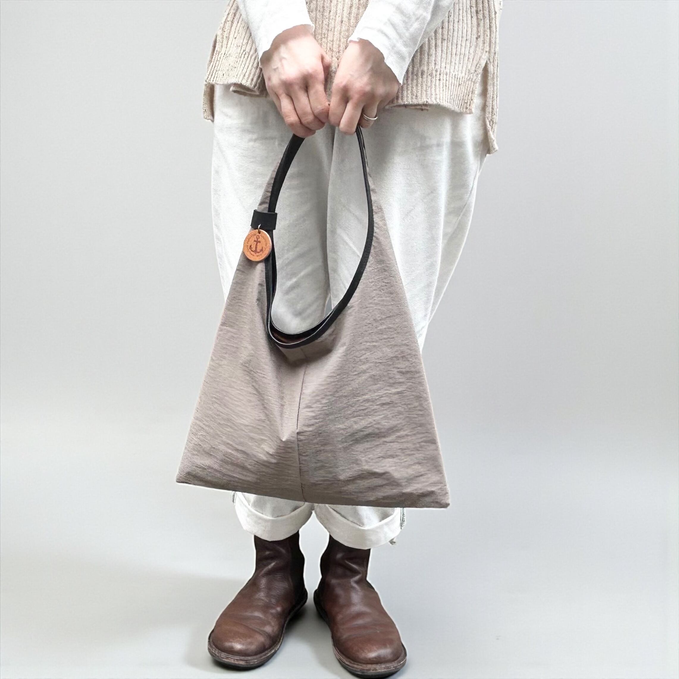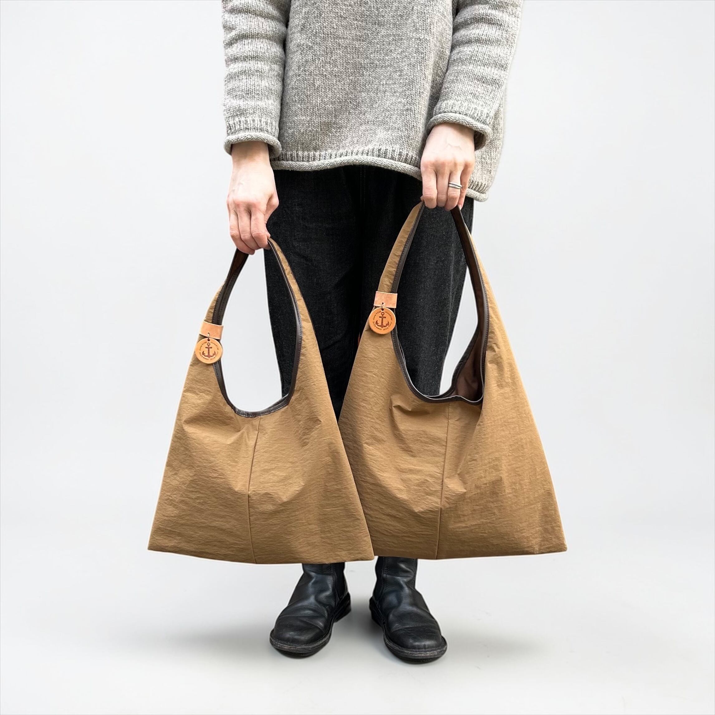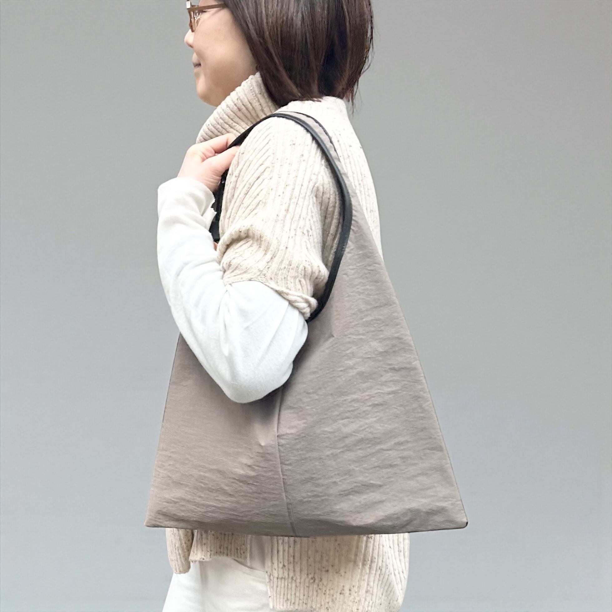 特殊な織りかたにより、昆布のような「ナチュラルでドライな風合い」で、ナイロンなのに温かみのある手触りが表現されています。パリッとした質感ですが、荷物を入れると柔らかな風合いになります。