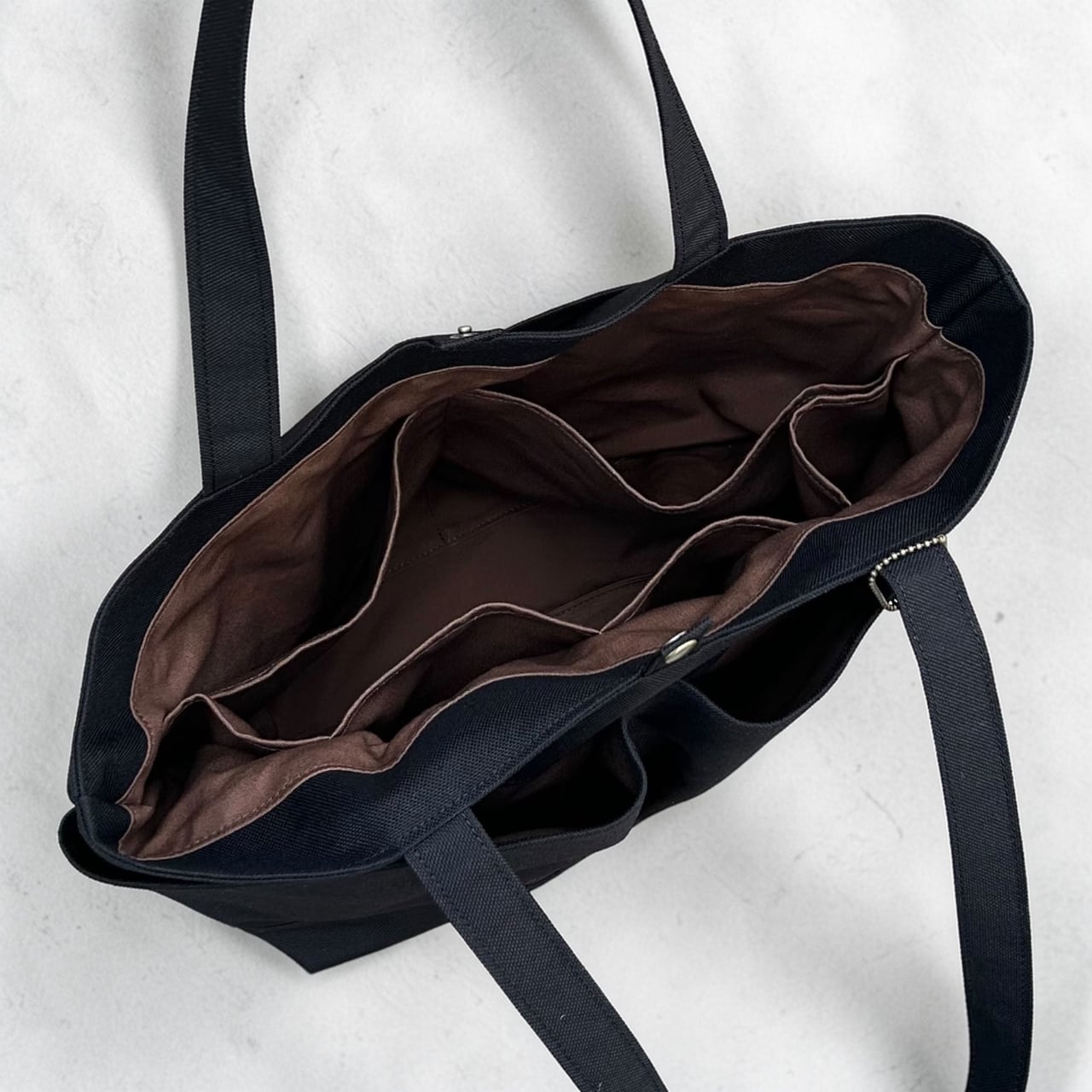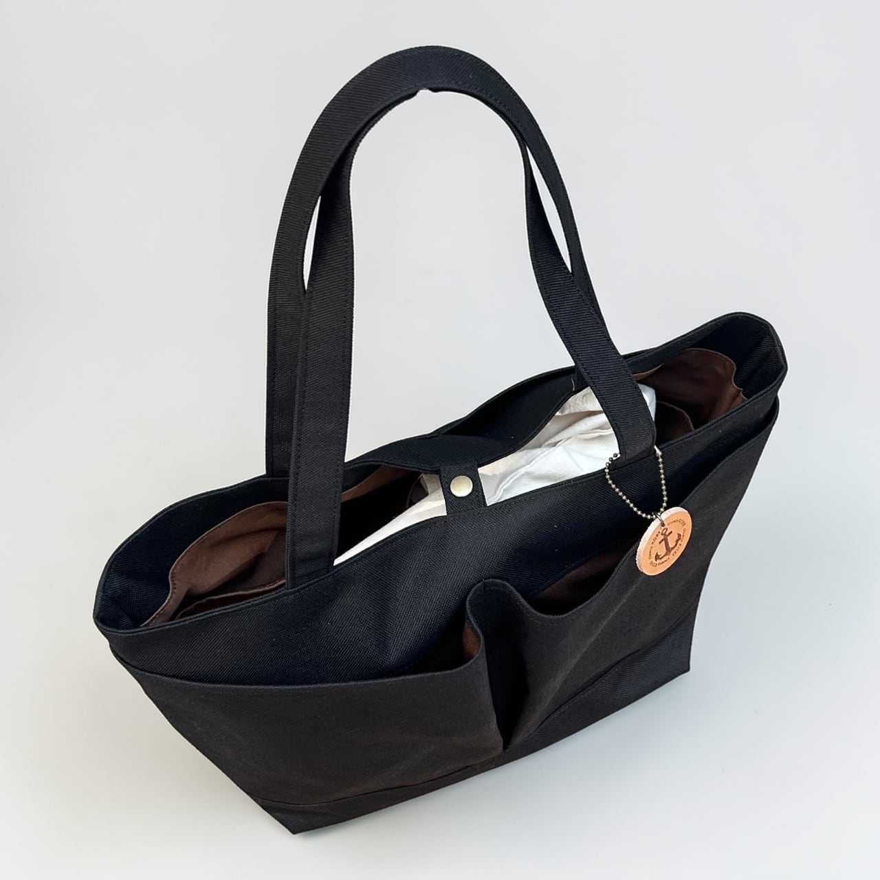 市場でお買い物をイメージして作ったバッグ。大き目のマチとたくさんのポケット(10個)が荷物をしっかりと受け止めてくれます。