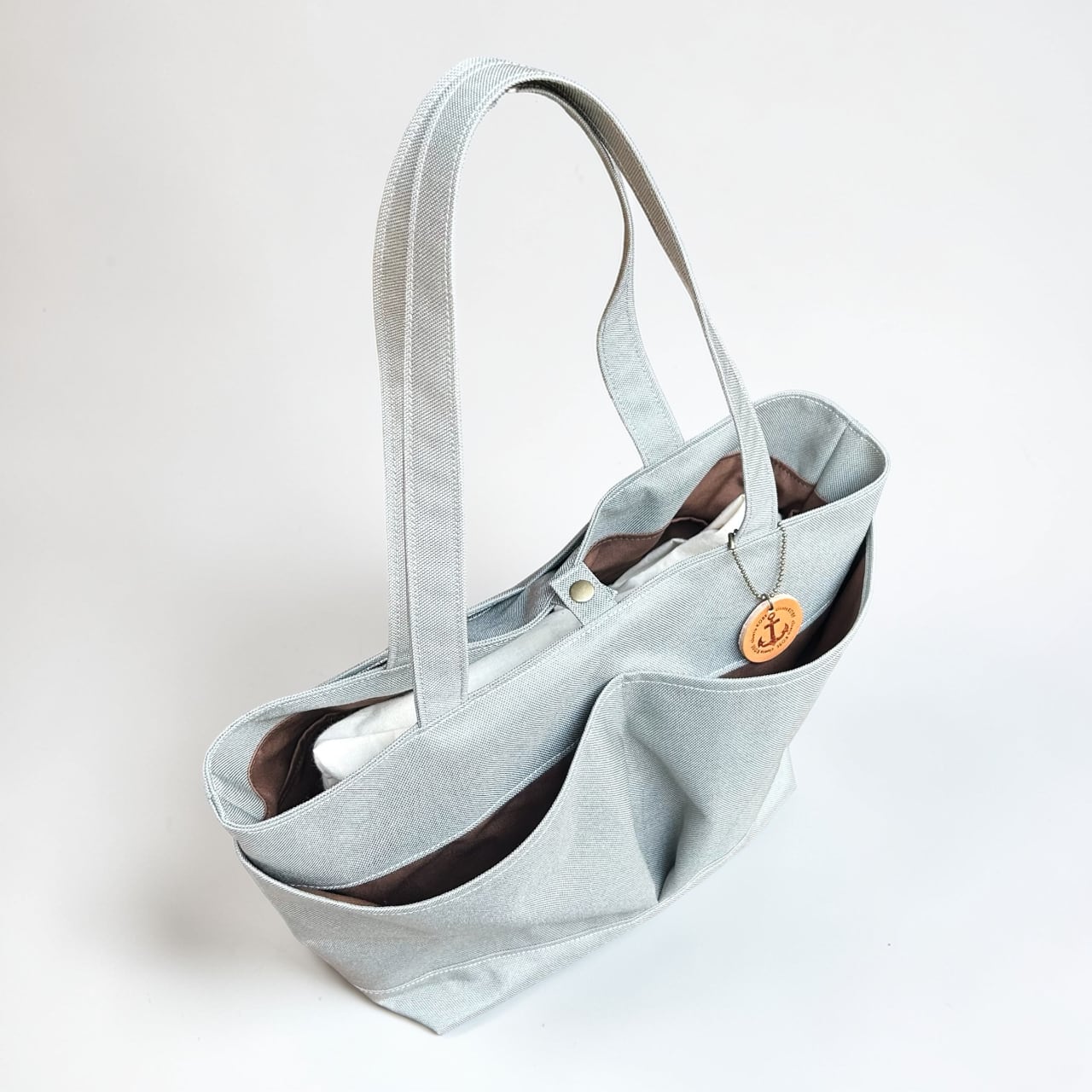 市場でお買い物をイメージして作ったバッグ。大き目のマチとたくさんのポケット(10個)が荷物をしっかりと受け止めてくれます。