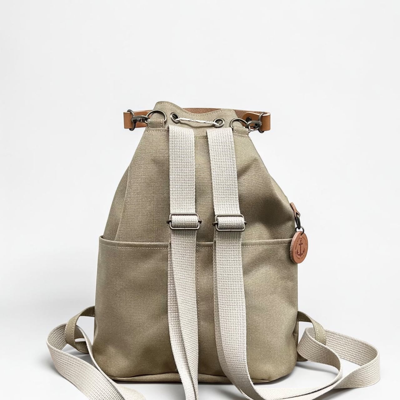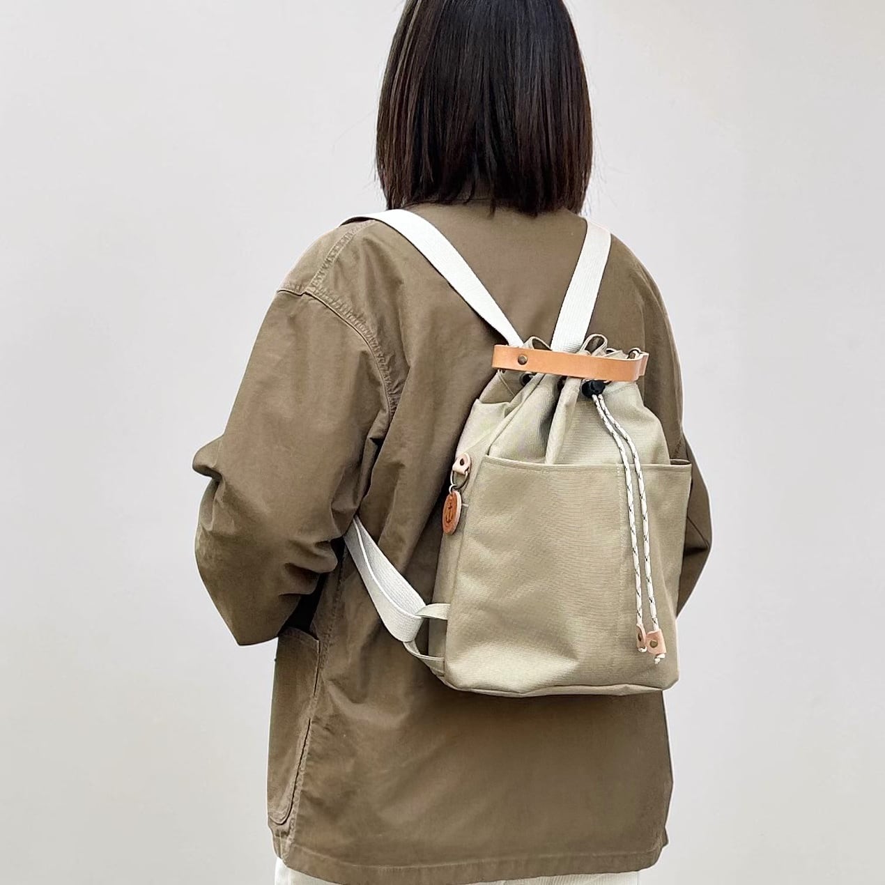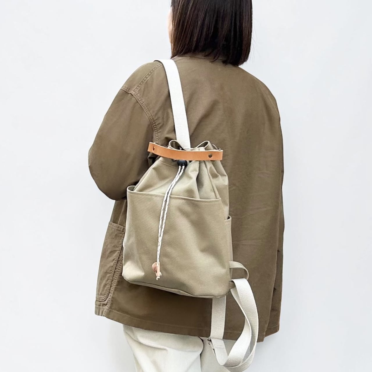 コンパクトで外ポケットの多い、巾着リュック。