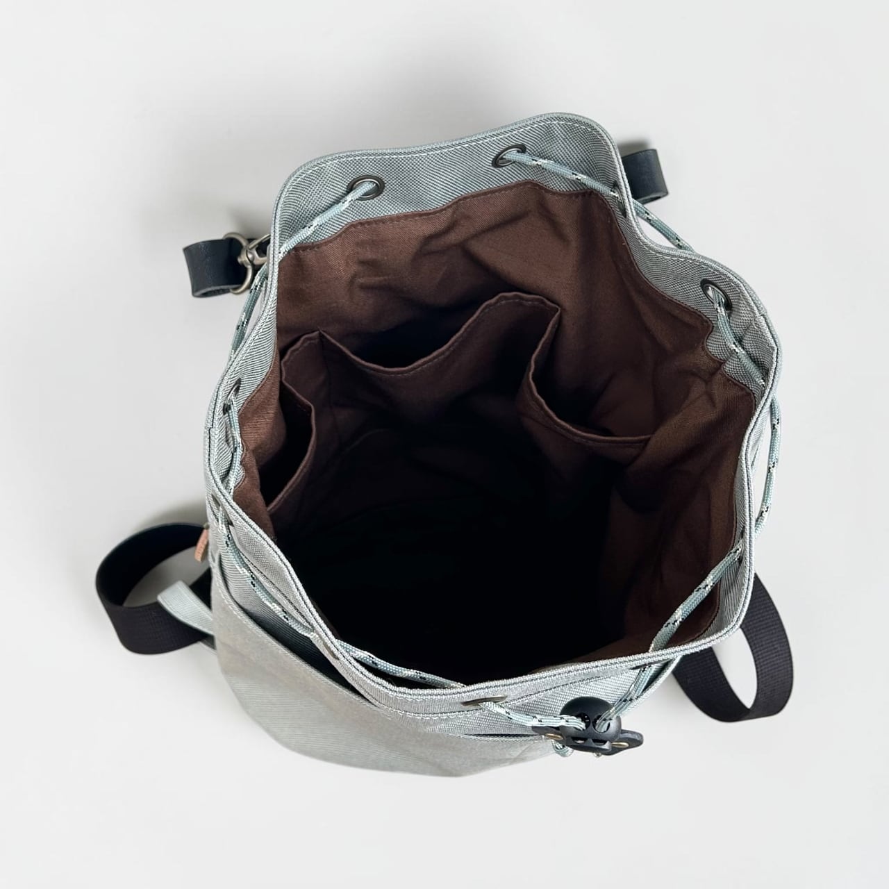コンパクトで外ポケットの多い、巾着リュック。
