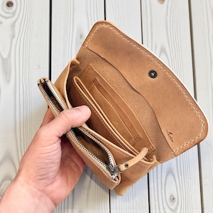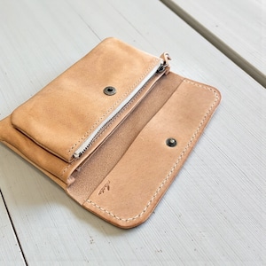 〇前に小さめのファスナー付ポーチ(主に小銭入れ)、後ろに札入れとカードなど収納できます